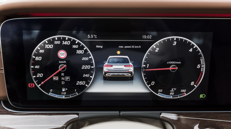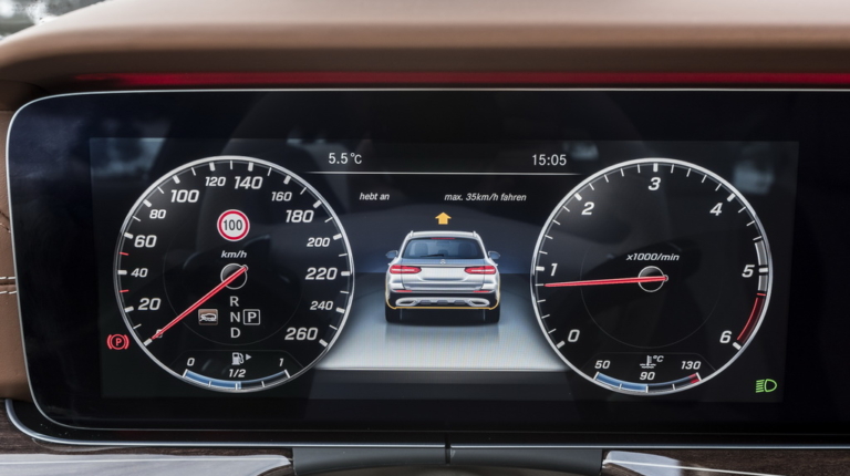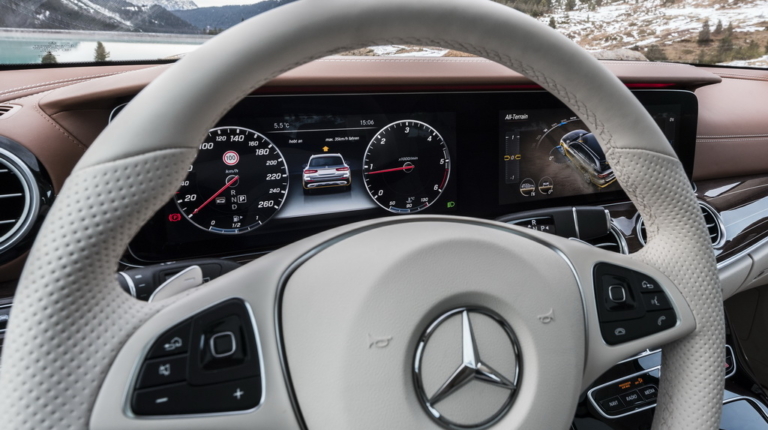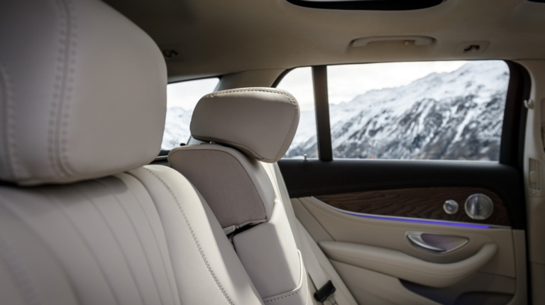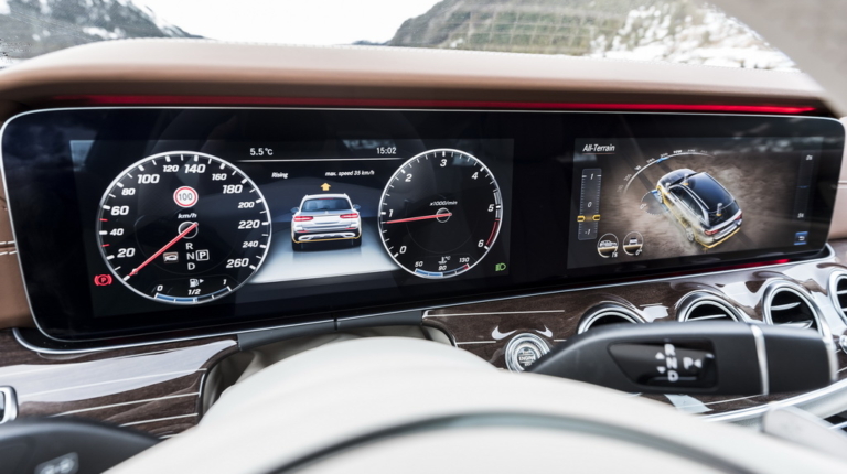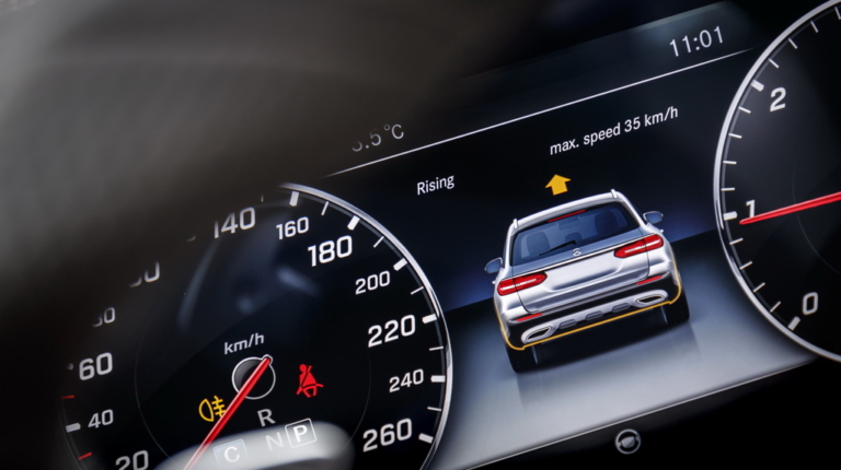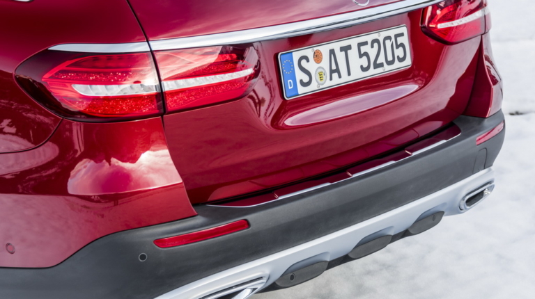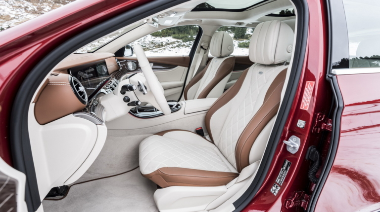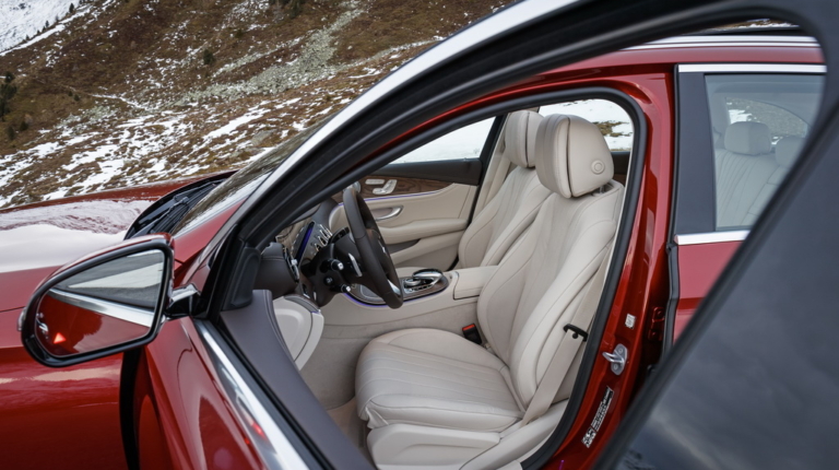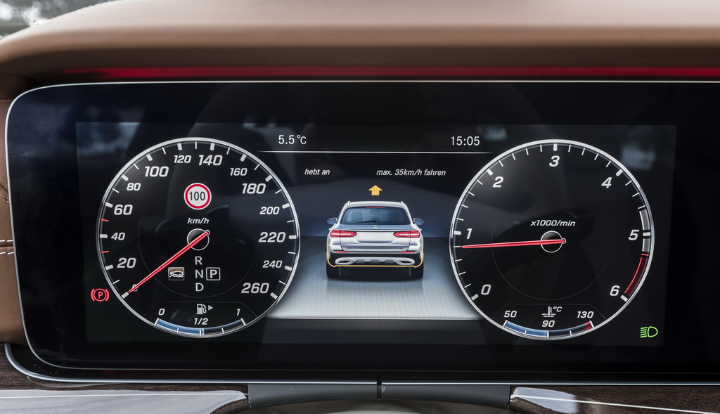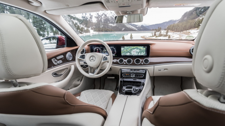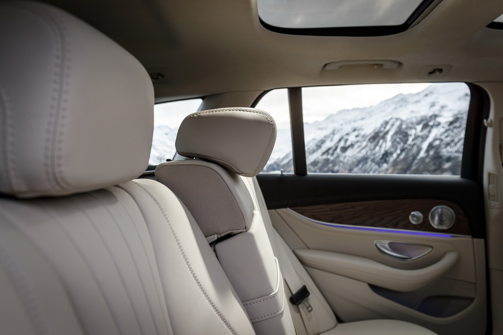 Дизайн салону практично стандартний, якщо взагалі щодо нового Е-класу доречна така характеристика. Це логічно: якщо зовнішні елементи мають увиразнити ексклюзивність версії і водночас несуть практичне навантаження, то в салоні навряд чи покупець захоче щось відмінне. Через це набір невеликий: спортивні педалі (нержавійка з гумовими вставками), особливі килимки, можливість замовити оздоблення «алюміній/карбон». У нас на тесті була версія з «деревом». І особисто я не такий прогресивний, щоб поміняти благородну деревину на карбон. Mercedes-Benz E-класу – не спорткар, і позашляховий стайлінг не робить його менш аристократичним. Австрійські Альпи – ось його середовище проживання, ви сьогодні в Зеєфельді підкорюєте схили, а завтра вивантажуєте лижі, вантажите дошки і вирушаєте в Португалію на серфінг. У програмі немає наметового містечка на Південному Бузі. Тому і позашляхові здібності цього автомобіля відповідають призначенню. Коронна фраза – «згодиться для форсування бордюрів» – тут просто недоречна: на бордюр, звісно, заїхати можна, але чи варто? Що за дитинство?