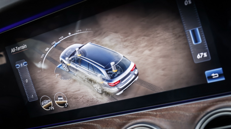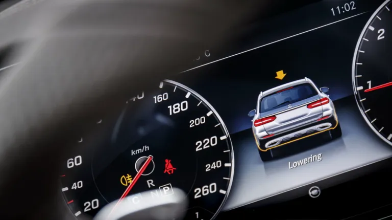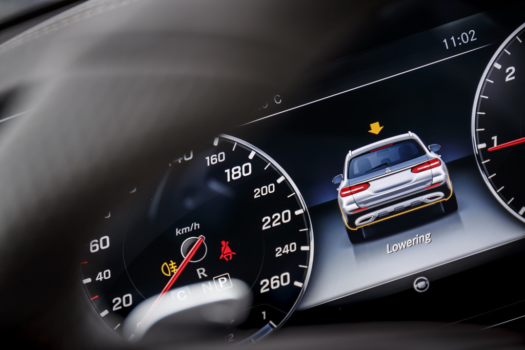 А за необхідності – повземо. Цікаво, як довго організатори шукали цю дорогу в лісі – так, щоб і машини не подряпати, і продемонструвати All-Terrain у всій красі. Але у них вийшло. У DynamicSelect тут, на відміну від звичайного Е-класу, не чотири, а п’ять режимів руху. «Зайвий» і назву має без особливих претензій – All-Terrain. Він активується перемикачем на консолі, і за швидкості до 35 км/год автомобіль піднімається над дорогою ще на 20 мм (це саме можна зробити і вручну на будь-якому іншому режимі – окремою кнопкою). Таким чином, кліренс у загальній гаммі регулюється в діапазоні від 121 до 156 мм, при цьому Е-клас All-Terrain взувається в шини з вищим профілем і завдяки тій самій пневмопідвісці комфортніший за звичайну версію. Тут по три пневокамери на задніх стійках, по дві – на передніх. Вони, крім іншого, відповідають і за комфорт. Так що під час руху лісовими дорогами пасажирам не варто хвилюватися – той самий абсолютний спокій. Як і в GLE, з переходом на All-Terrain змінюються налаштування і ESP, ASR – для мобілізації позашляхових здібностей. А на основному дисплеї все це відображається в прекрасною графіку. Головне – втриматися і дивитися вперед, а не на екран: тут вам і кут повороту рульового колеса, і положення пневмопідвіски, а також кут поздовжнього нахилу і крени, положення педалей газу і гальма і навіть компас.