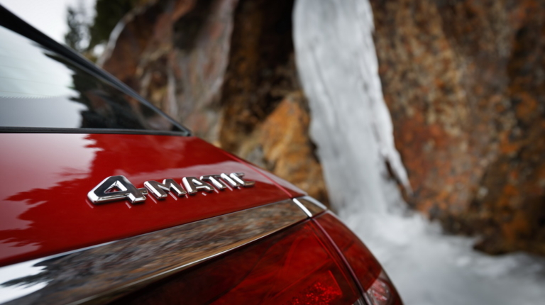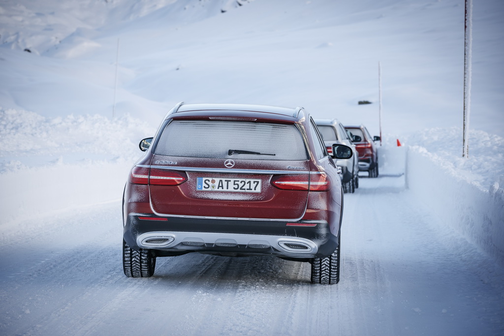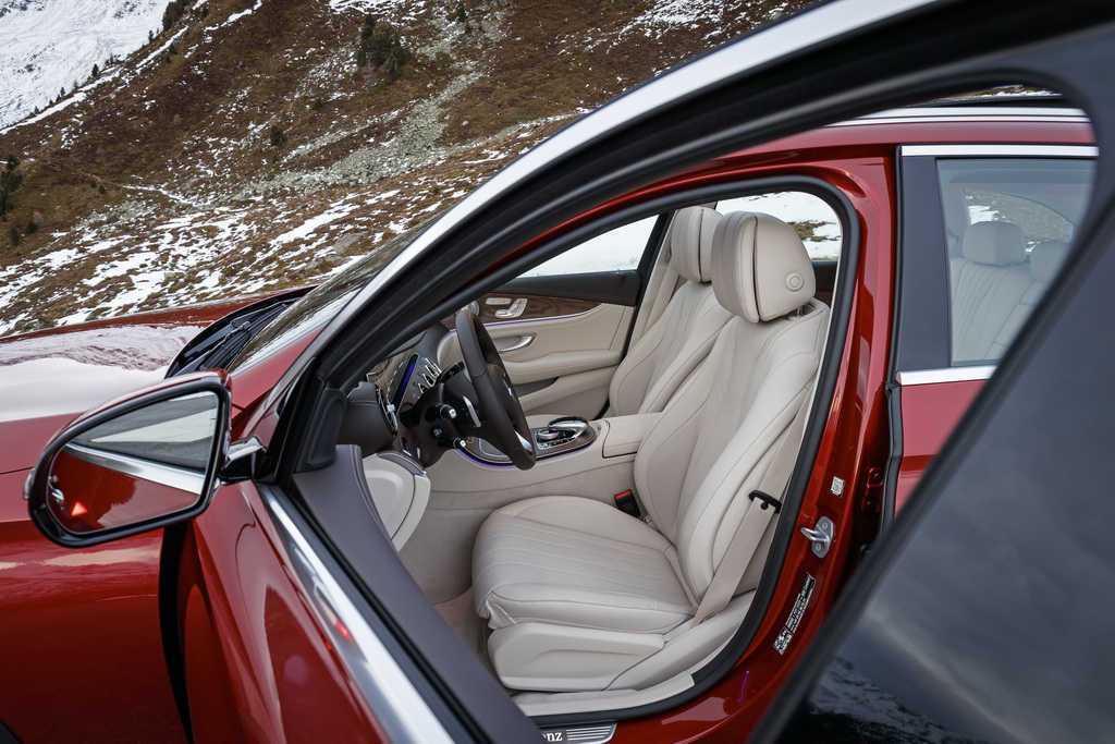 Але поки що – сніг. Сувора жінка-інструктор влаштовує нас в колону і підказує по рації, де і що перемикати в салоні. Ми піднімаємося вище в гори, асфальт починає поступатися місцем плямам криги і нарешті змінюється чистим снігом, вкатаним до гладкості бобслейної траси. «Перемикаємо DynamicSelect до положення…» Що? Я чекав, що ми зараз перевірятимемо той самий All-Terrain – режим, якого немає у звичайного Е-класу, зате є у GLE. Але інструктор випалює: «Sport!» – і це круто! Повний привід у Е-класу влаштований не так, як у більшості сучасних кросоверів і універсалів підвищеної прохідності. З новим поколінням Е-класу система 4Matic суттєво змінилася: тепер роздавальна коробка не інтегрована у 9-ступінчасту КП, а винесена в окремий вузол, зі своїм мастилом і гідравлічним контуром. І працює вона хоч і за відомими принципами, але за іншою схемою: крутильний момент тут розподіляється у співвідношенні 45:55 – практично симетричний повний привід, але все ж із невеликим акцентом на задню вісь. А якщо одне з коліс (або кілька) втрачає контакт із дорожнім покриттям, крутильний момент миттєво передається на колеса, що мають краще зчеплення з дорогою. Працює це чудово. Про те, що під колесами практично голий лід, ти дізнаєшся тільки на спуску, коли обережний колега попереду скидає швидкість, а ти щасливий, як у дитинстві під час катання на санчатах, вилітаєш з-за чергового віражу і бачиш перед собою характерну корму з промінчиками гальмівних вогнів. Гальмо в підлогу – і далі ковзаємо – стрекочемо електронікою. Встигнемо? Встигли. Зберегли компанії тестовий автомобіль, слава всемогутній ESP. Але як він входить у ці віражі! А адже машина завдовжки 4947 мм, з базою 2939 мм, і при цьому ще на 29 мм вища, ніж звичайний Е-клас. Заслуга здебільшого – того ж повного приводу, але також і багатокамерної пневматичної підвіски AirBodyControl. Після переходу в режим Sport під час набору швидкості вище 35 км/год дорожній просвіт зменшується до 121 мм, підвіска затискається – не їдемо, а летимо!