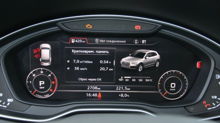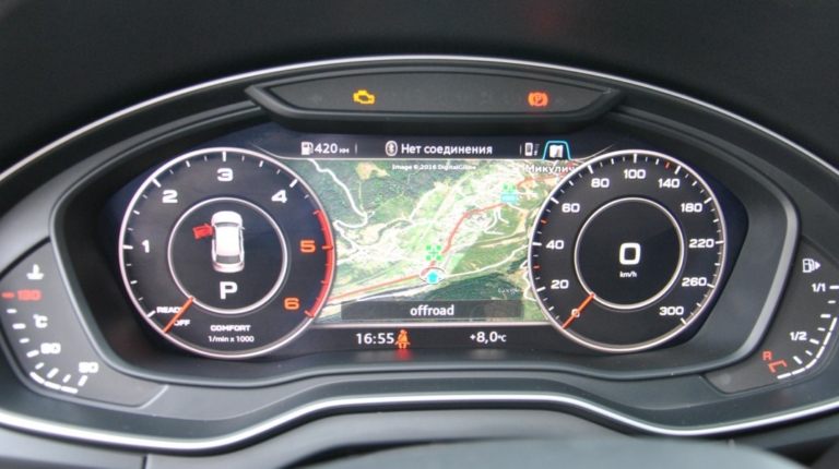 Кроме того, в начальных вариантах установлены привычные аналоговые приборы, а в данном авто – виртуальная приборная панель с возможностью изменения конфигурации и вывода на экран карты навигационной системы. Информация проецируется и на лобовое стекло.