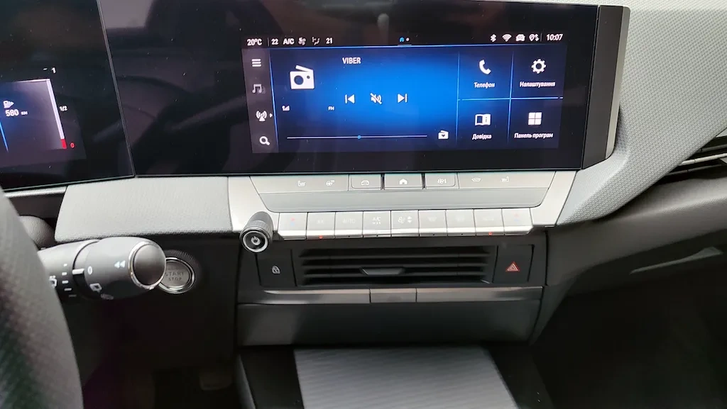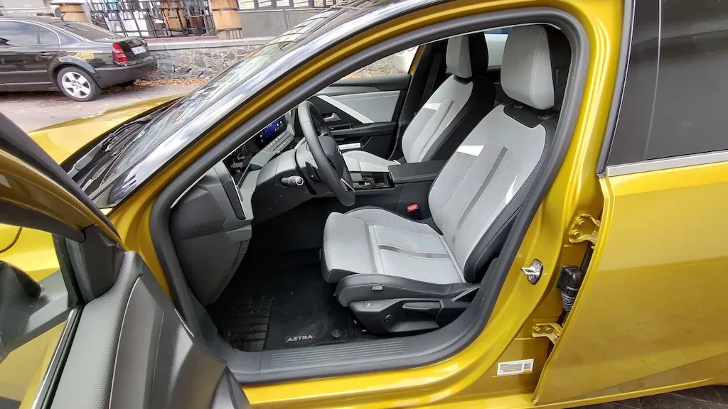 Інтерʼєр витриманий в тому ж стилі, що і зовнішність. Багато вставок лакованого чорного пластику, мало деталей, що візуально виділяються. Панель приладів перед водієм та екран праворуч об'єднані в довгий неперервний блок, а ліва частина з дефлектором обдуву так само інтегрована цю довгу скляну полосу. Обидва екрани діагоналлю по 10 дюймів, проте за рахунок того що вони обʼєднані суцільною чорною панеллю все виглядає як єдиний безперервний блок. Такого ж чорного блискучого пластику багато на центральній консолі та навіть кнопках на кермі. Виглядає стильно, та сподіваюсь так само буде виглядати і через рік експлуатації і не задряпається. Дизайн панелі приладів у Астри дуже лаконічний та техногенний. Дивна річ, але такий холодний та вуглуватий дизайн виявився напрочуд зручним. Німці відмінно попрацювали над ергономікою.