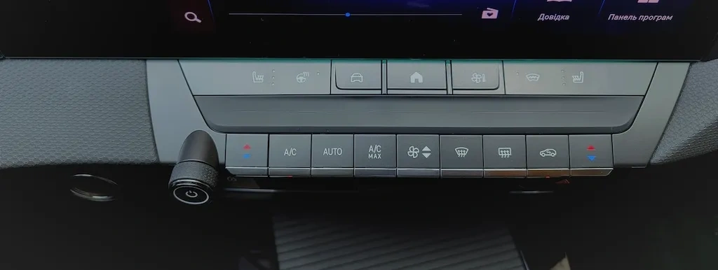 Зручно що залишили багато можливостей керувати певними функціями за допомогою гарячих кнопок, а не через меню. Прямо біля екрана знаходяться три основних кнопки меню. Це налаштування автомобіля, домашня сторінка та розширене керування клімат-контролю. Наша машина в топовий комплектації має роздільний клімат-контроль. Керувати ним можна за допомогою зручних клавіш які розташовані трохи нижче основного екрану.