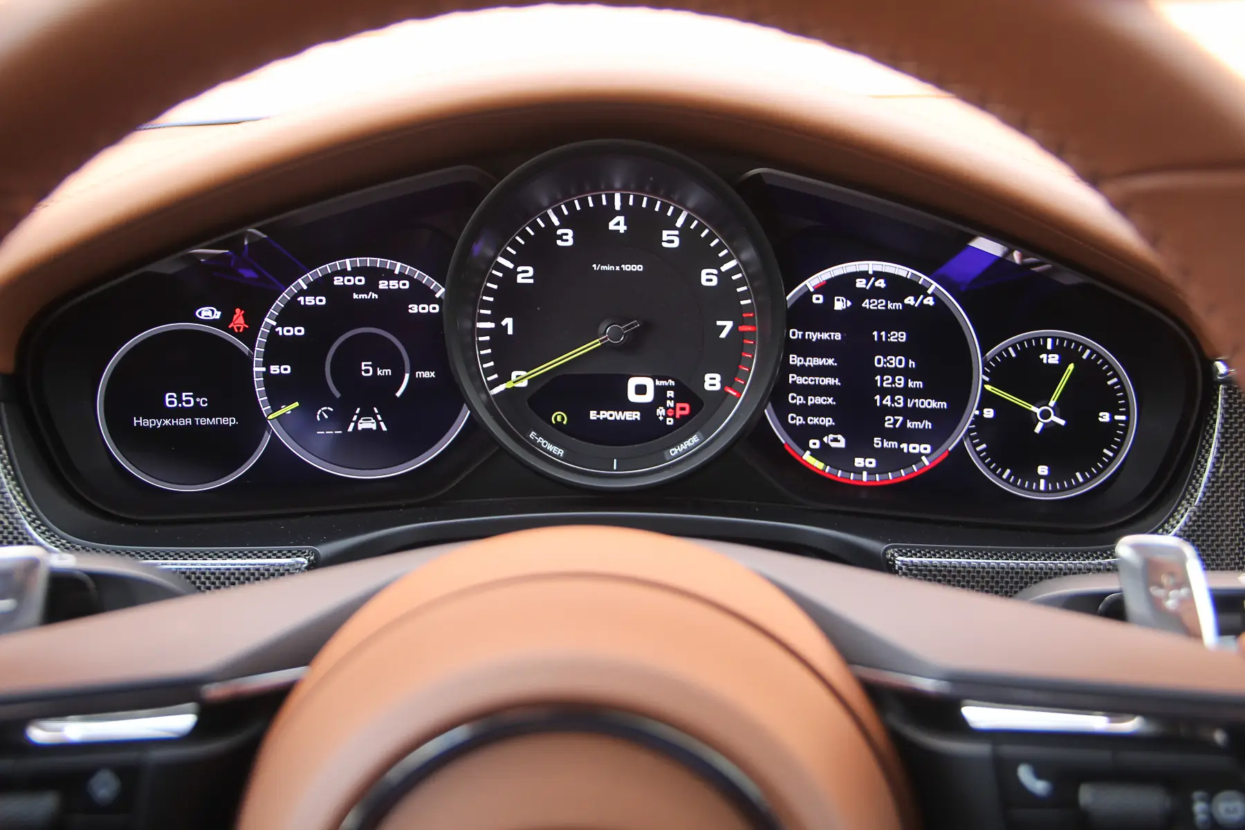 Но перед тобой вертикально установленный руль, “парад приборов” с тахометром во главе и отвесная передняя панель, щедро инкрустированная карбоном. Погружение в мир Porsche начинается!