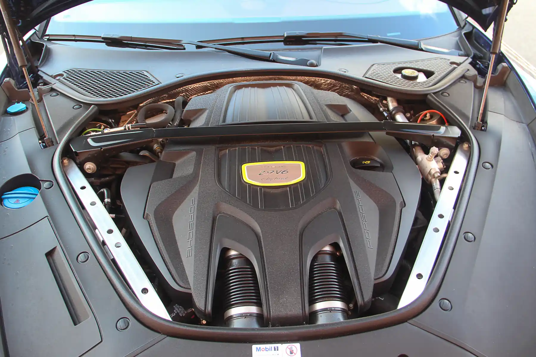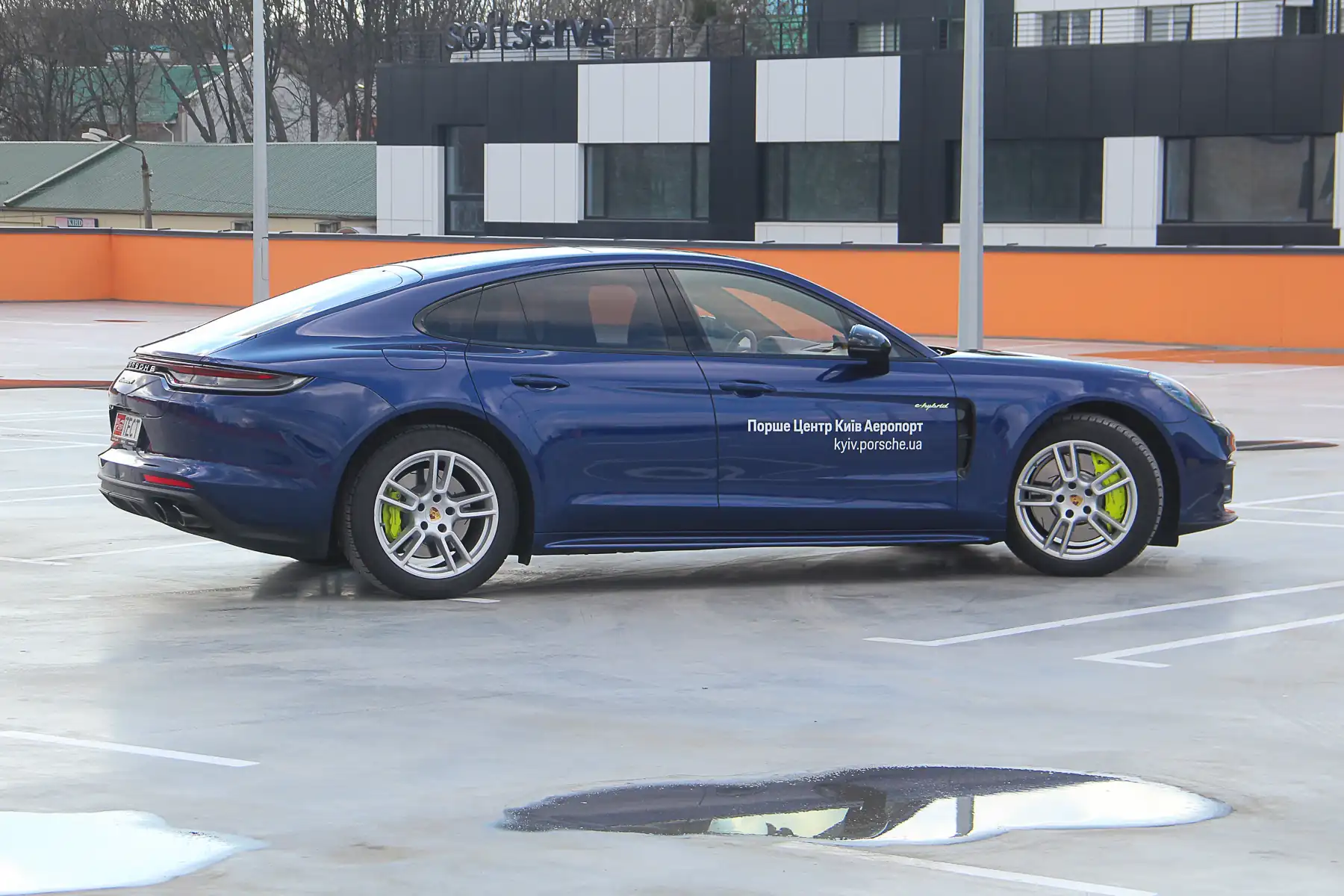 Гибридную версию легче всего опознать по ярко-зеленым шильдикам и тормозным суппортам. Но если первые выглядят аккуратно и ненавязчиво, то вторые уж как-то очень “игриво”. В то же время сочетание глубокого синего цвета и черных колесных дисков просто великолепно! Ну и безусловно, E-Hybrid имеет второй лючок, под которым скрывается порт для зарядки Type 2. Разъем популярный, найти зарядную станцию с таким не проблема. К этой теме мы еще обязательно вернемся, а пока что думать об этом рано. Да и зачем, если спорткар (а это именно он!) заправлен и заряжен.