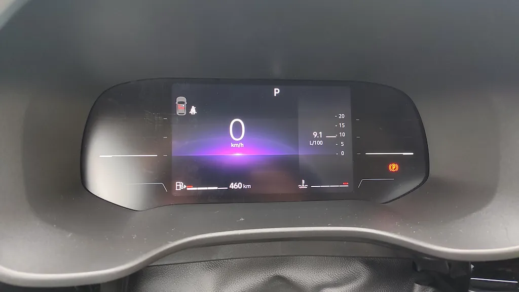 Багато елементів в салоні Kardian такі ж як в новому Duster. Зокрема, комбінація приладів в нашій комплектації це 7-дюймовий екран. Дизайн доволі простий і лаконічний. На табло виводяться показник режиму КП, швидкість, внизу є індикація температури двигуна і рівня палива. До речі, кнопками можна обрати варіант панелі з індикацією обертів двигуна, або без неї.