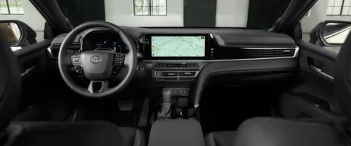 Коли сідаєш в салон нового покоління Камрі, то відчуваєш, що тут більше змін, ніж зовнішності авто. Салон став більш лаконічним, стриманим. Зникли вигнуті складні лінії центральної консолі. А центральне місце в салоні віддали великому горизонтально витягнутому дисплею.