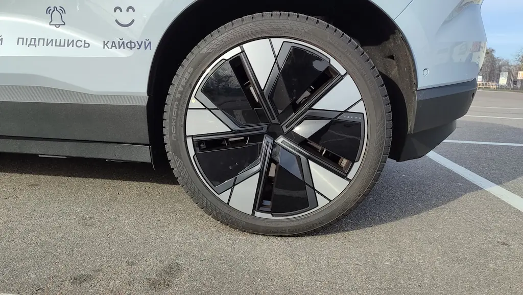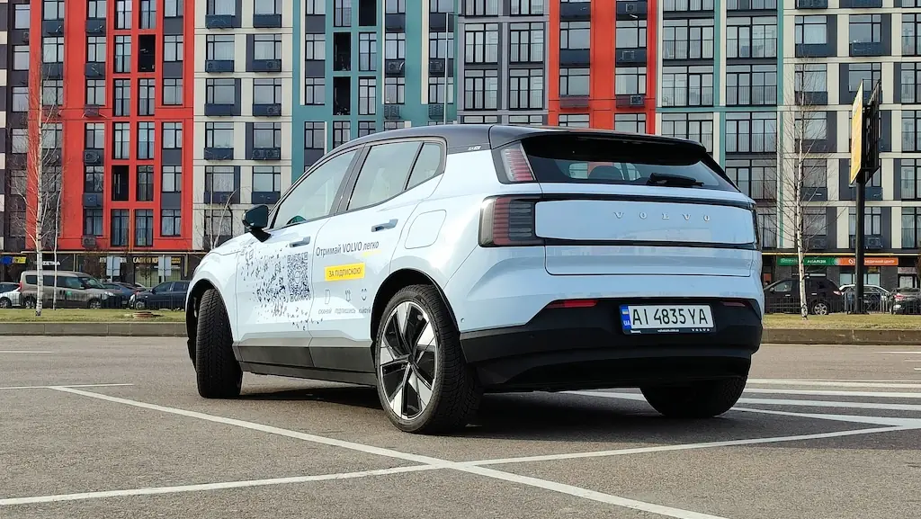 Тут і великі фари з фірмовими вольвовськми денними ходовими вогнями в формі молота Тора, двоповерхова задня оптика, яку видно навіть при погляді на авто збоку, велика колісна база в 2,65 м і малі звиси кузова та здоровецькі, для таких габаритів авто, 20-дюймові колеса. В нашому EX30 ситуацію трохи псують тільки наклейки на борту машини. Без них EX30 значно симпатичніший. Проте, наклейки теж про цікаву штуку, але про те в розділі “Ціна”.