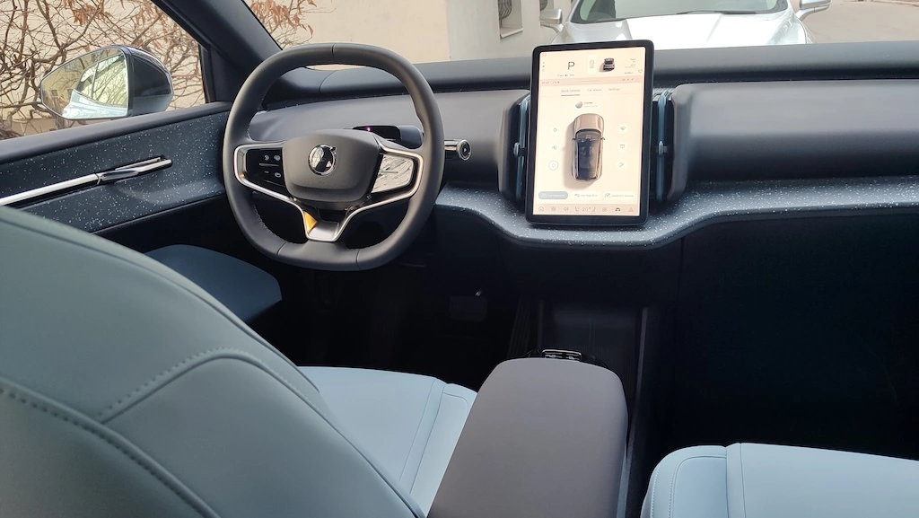 В маленькому Volvo EX30 дивним чином поєднується хайтек, та людяна продуманість. Коли дивишся на максимально лаконічний салон, то спочатку здається що тобі тут наче не дуже і раді. Прямокутне маленьке кермо, планшет та пару перемикачів на кермовій колонці. А передня панель то взагалі якась дивна. Та чого дивуватись. Машина вся буквально протята ідеєю екофрендлі та захисту довкілля. Дивний колір та структура торпедо такі незвичні тому, що зроблене воно з вторинно переробленого пластику. Можу закластись що цим буде хизуватись значно менше власників, аніж тих хто вихвалявся що в його BMW i3 карти дверей зроблені з конопель.
