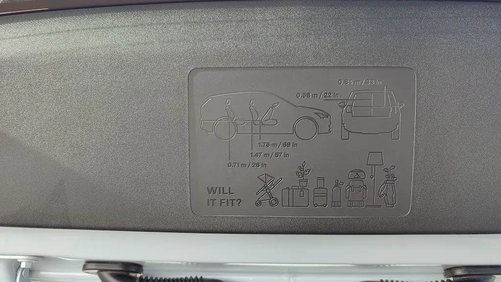 Цікаво, що при всьому мінімалізму салону дизайнери зробили купу пасхалок. Так на пластикових деталях, як то лотки внизу центрального тоннеля, або кришка речового відділення під капотом мають смішні картинки лісу, лося та авто. Але не тільки заради розваги в EX30 є малюнки. Зокрема на кришці багажника зсередини нанесений інформаційний малюнок з розмірами поклажі, яку можна перевезти а також варіантами трансформації салону.