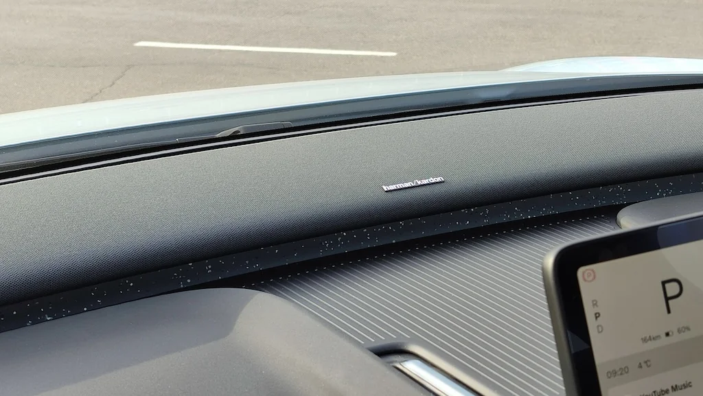 Цікава фішка EX30 - конструкція передніх дверей. В них величезні відділення для різного багажу. А такі великі вони за рахунок того, що нема динаміків аудіосистеми. Незвичне рішення. Замість них перед передніми пасажирами під лобовим склом на всю ширину салона розташований саундбар від знаного бренду Harman/Kardon. Проте, коли слухаєш музику, то чуєш що звук йде так само і ззаду. Але тут все традиційно. Позаду колонки розташувались в дверях.