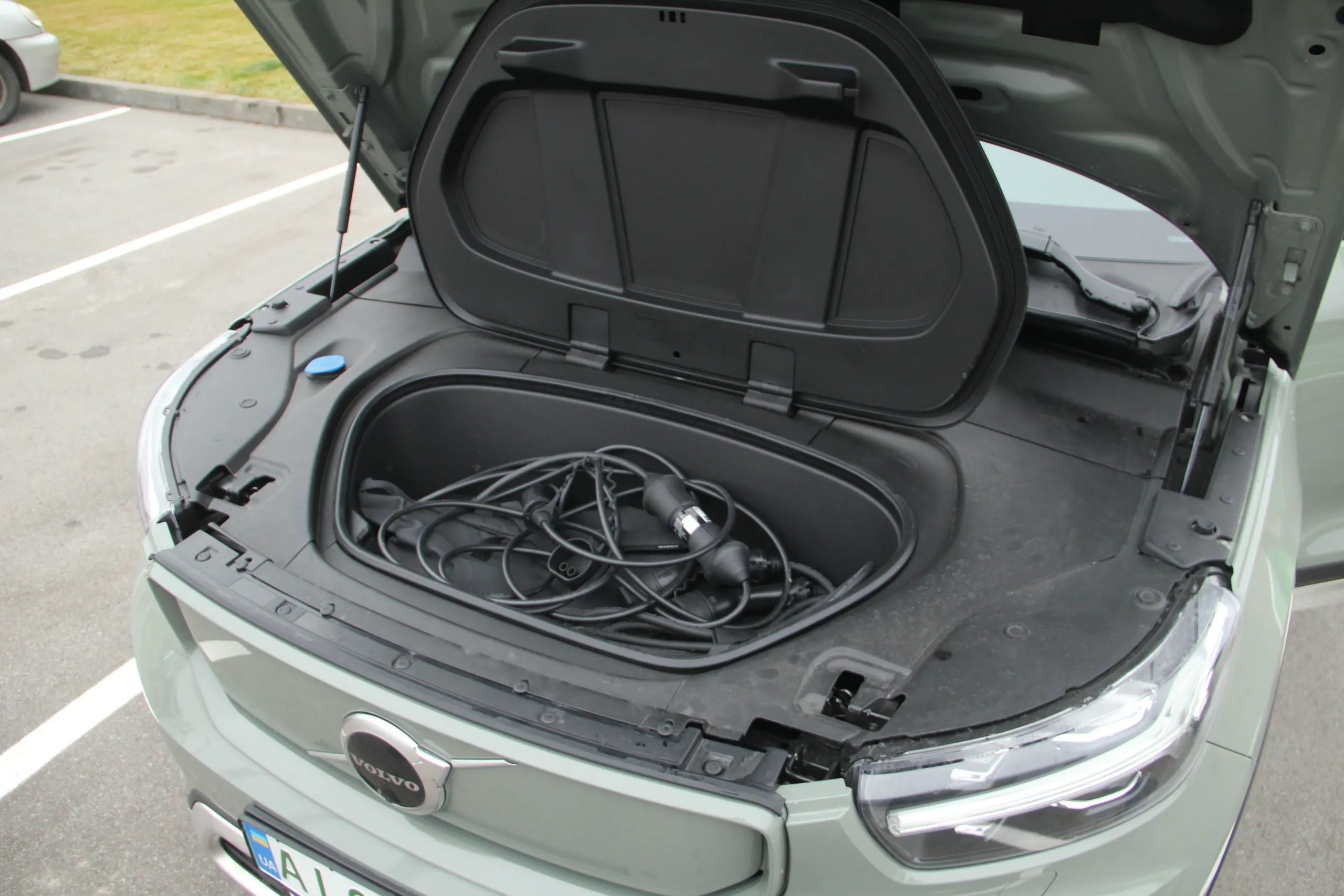 Втім, на зарядку їхати все одно доведеться. Так, якщо ви живете в приватному будинку, з цим не буде жодних проблем, а в інших випадках краще мати пару надійних зарядних точок на прикметі. Мені пощастило не одразу: спочатку довелося шукати власника звичайного автомобіля, який залишив його на місці для зарядки, і просити від’їхати, потім намагатись “поперемогти” саму зарядну станцію. Метушню з проводами в сиру погоду я вже до уваги не беру. До речі, цей бокс для дротів під капотом і все навколо нього – пластикове, так що після зарядки в дощ або сніг складати їх туди не страшно – все легко чиститься.
