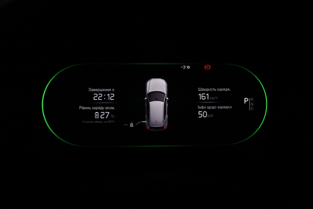 Роз’єм для заряджання один, але комбінований: він поєднує в собі Type 2 (заряджання змінним струмом) і CCS 2 (швидке заряджання постійним струмом). Остання може зарядити батарею до 80% всього за півгодини, але якщо ви знайдете швидку зарядку на 150 кВт і більше. Адже саме стільки готовий приймати автомобіль. Більшість швидких зарядок у Києві здатні видавати 50 кВт, і якщо не розряджати батарею “у нуль”, то за годину (а то й менше) можна спокійно зарядитися до повного. Зарядка змінним струмом звісно повільніша, адже по ній автомобіль приймає 11 кВт на годину.