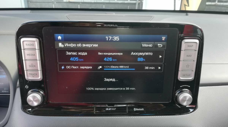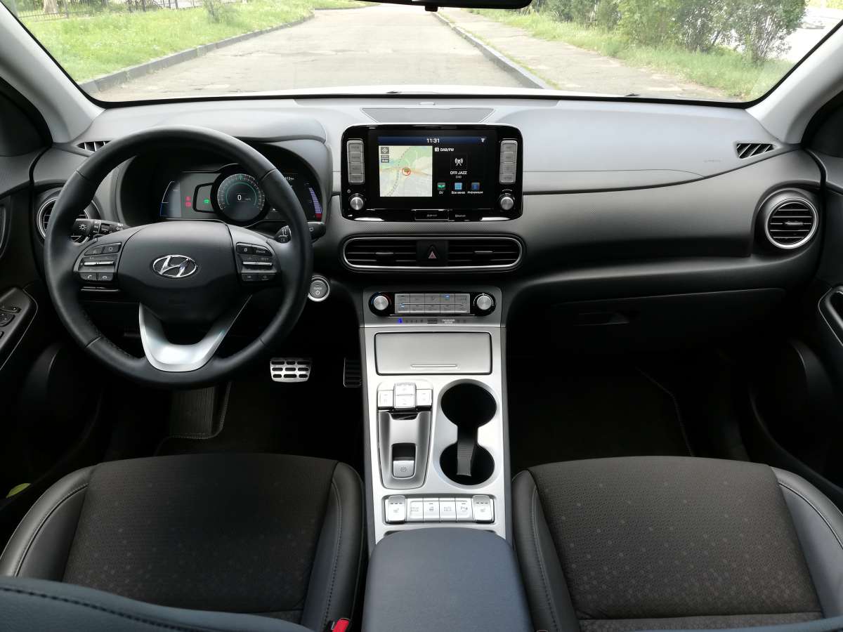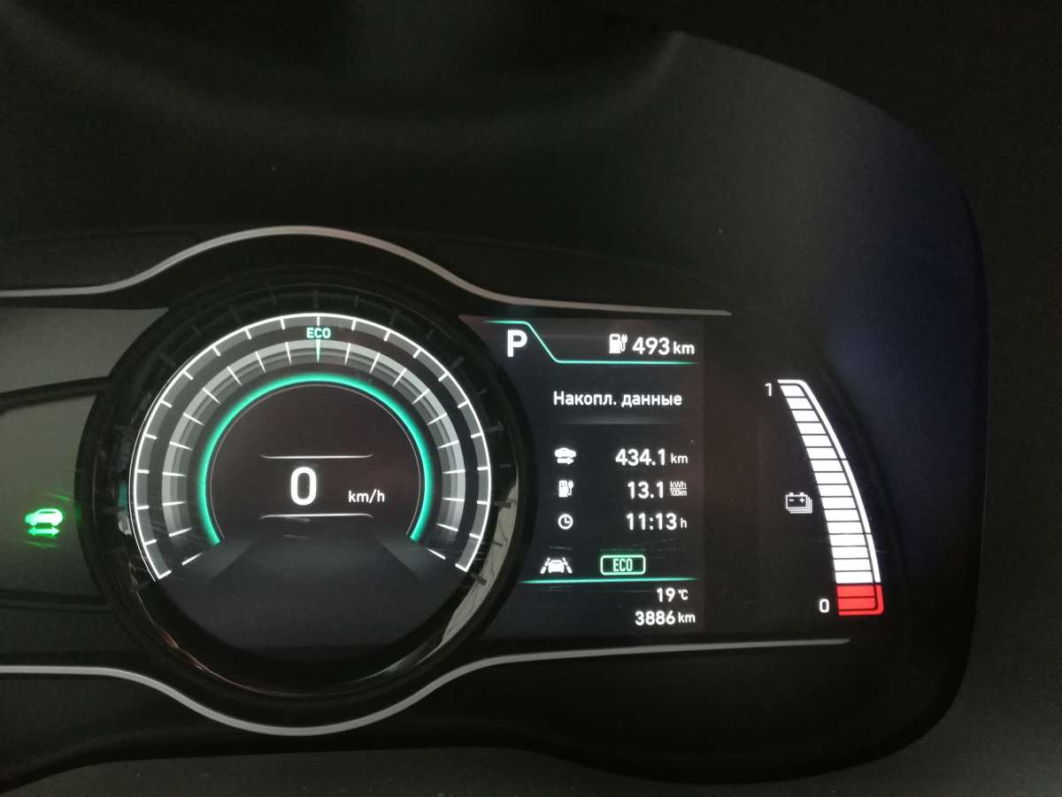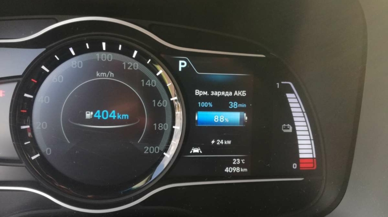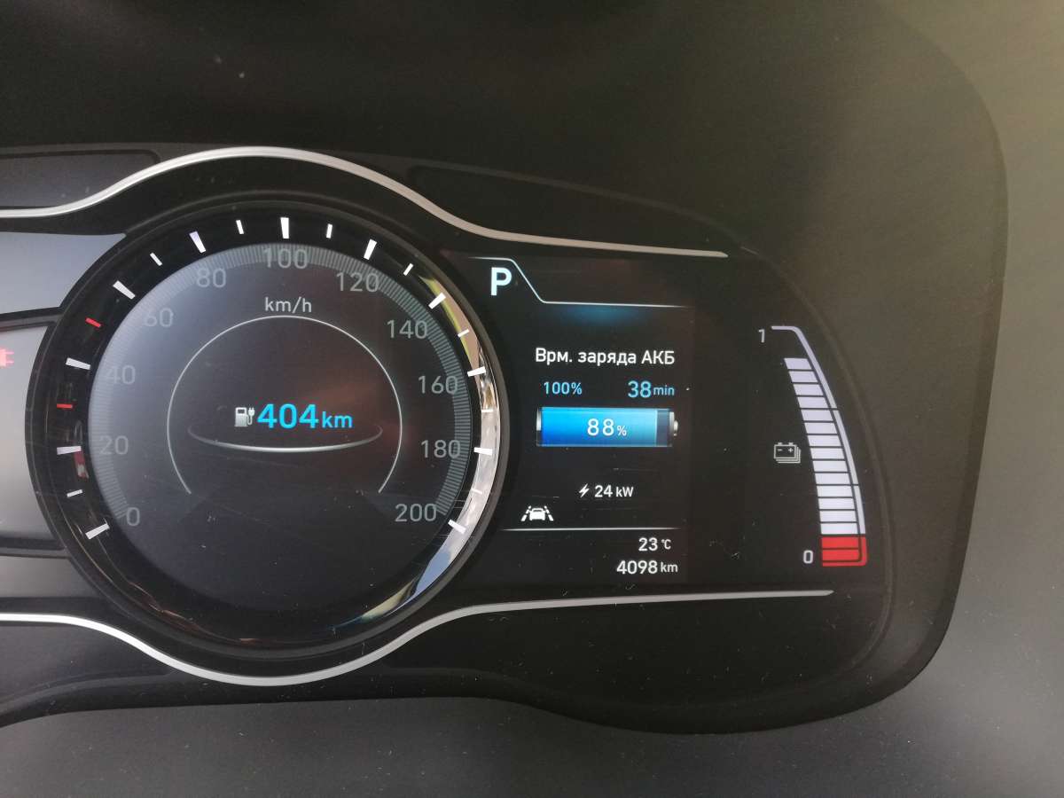 За рулем я устроился очень быстро, попутно отметив, что даже у водительского сидения регулировки механические. Скромно, но зато на посадку не жалуюсь. Зато информацией водитель точно не обделен: на электронном щитке приборов и показания борт-компьютера, и запас хода, и текущая работа системы рекуперации. На экран мультимедийной системы (оба “монитора” диагональю 7 дюймов) можно вывести вкладку EV c подробной информацией о расходе электроэнергии и о зарядке батареи. А еще у Hyundai есть очень наглядная фишка, которая показывает, радиус, на который можно уехать на текущем заряде. В нашем случае можно, например, мотнуться в Одессу или даже Минск. Но это если мерить строго по прямой…