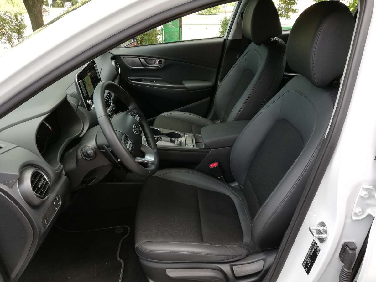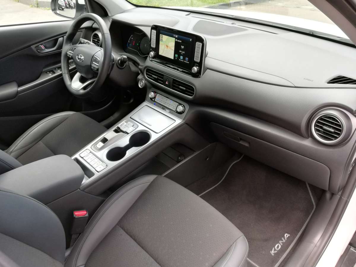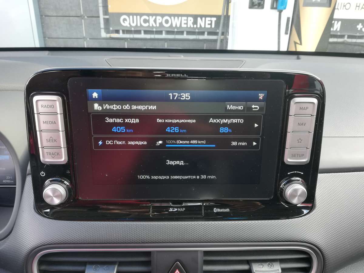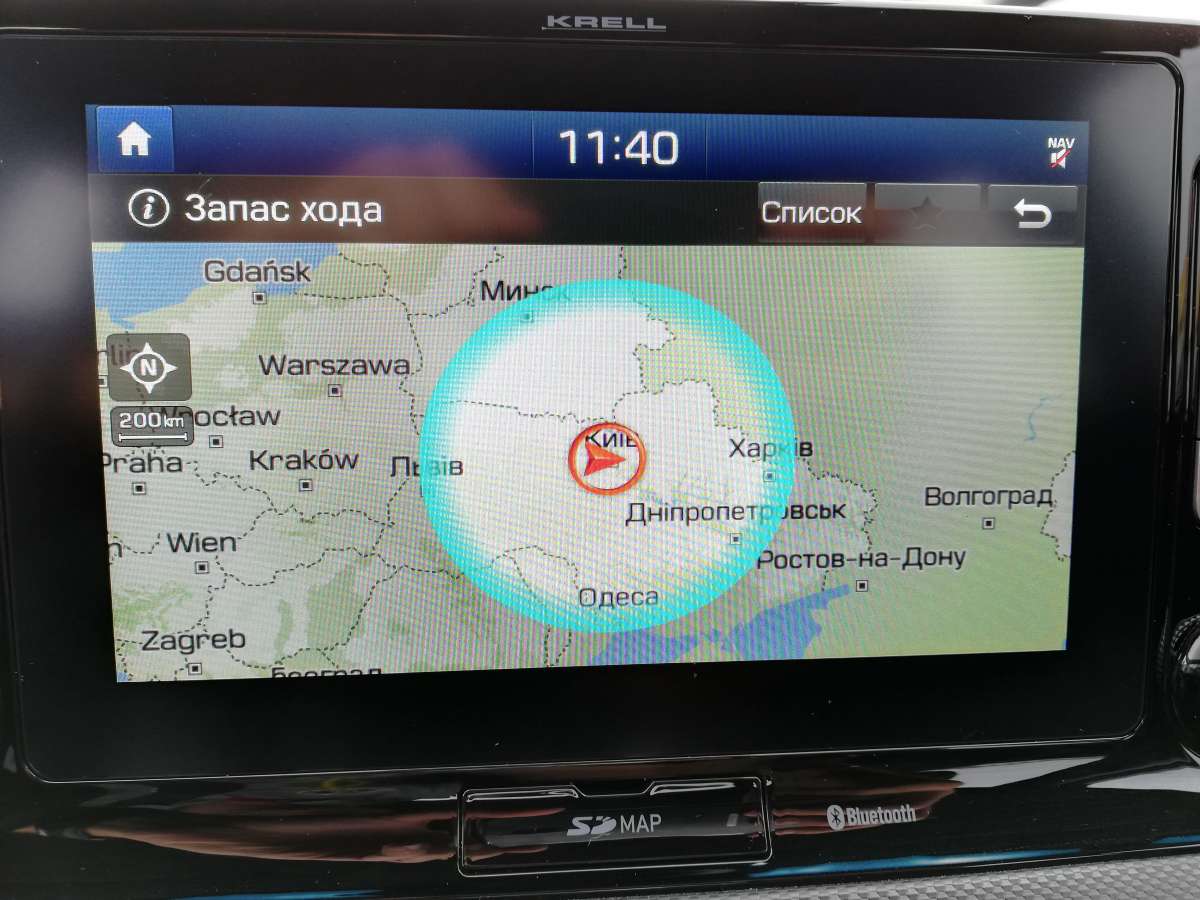 За рулем я устроился очень быстро, попутно отметив, что даже у водительского сидения регулировки механические. Скромно, но зато на посадку не жалуюсь. Зато информацией водитель точно не обделен: на электронном щитке приборов и показания борт-компьютера, и запас хода, и текущая работа системы рекуперации. На экран мультимедийной системы (оба “монитора” диагональю 7 дюймов) можно вывести вкладку EV c подробной информацией о расходе электроэнергии и о зарядке батареи. А еще у Hyundai есть очень наглядная фишка, которая показывает, радиус, на который можно уехать на текущем заряде. В нашем случае можно, например, мотнуться в Одессу или даже Минск. Но это если мерить строго по прямой…