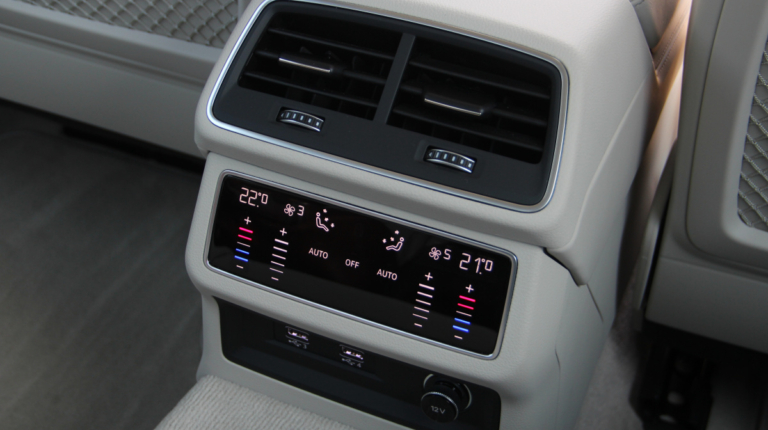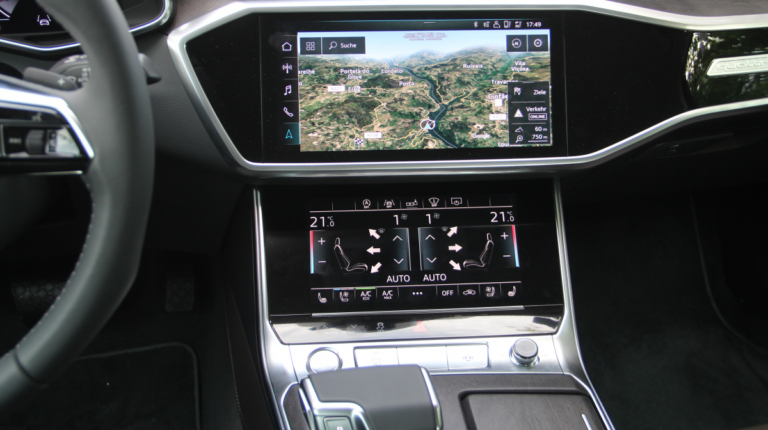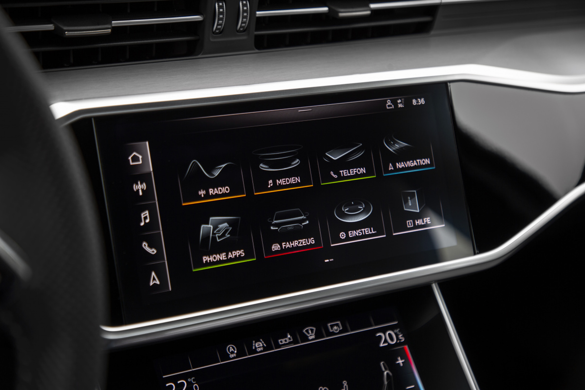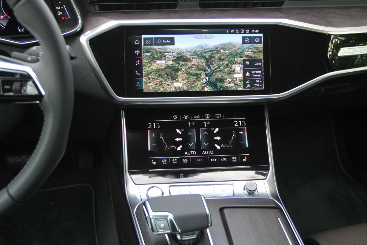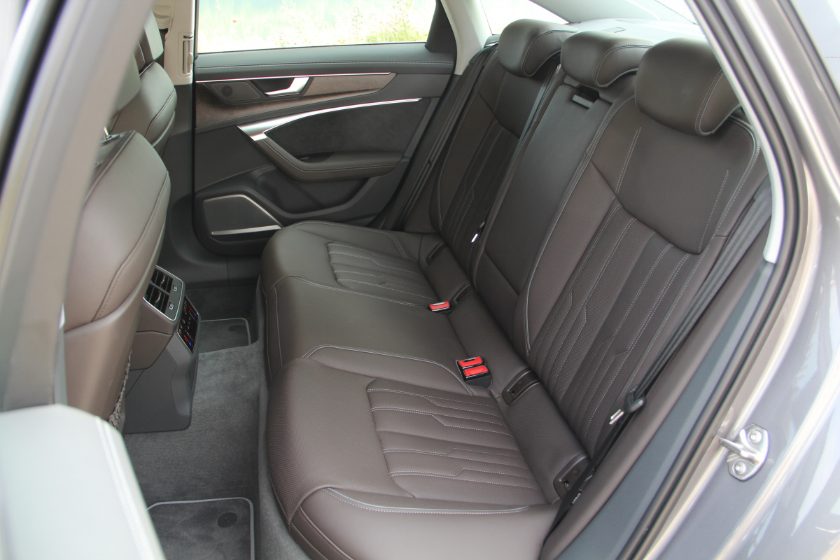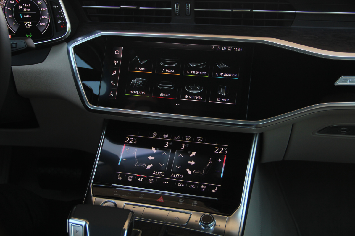 В салоне Audi А6 стала просторнее, по крайней мере разработчики рапортуют о прибавке в 21 мм по длине. На практике, действительно, внутри абсолютно не тесно, хороший запас места и по высоте, и по диапазону регулировок рулевого колеса и кресел для моего роста 1,82 м. Задний диван встречает глубокой посадкой, солидным простором для ног и над головой, а также опциональным двухзонным климат-контролем. Конечно же, сенсорным!