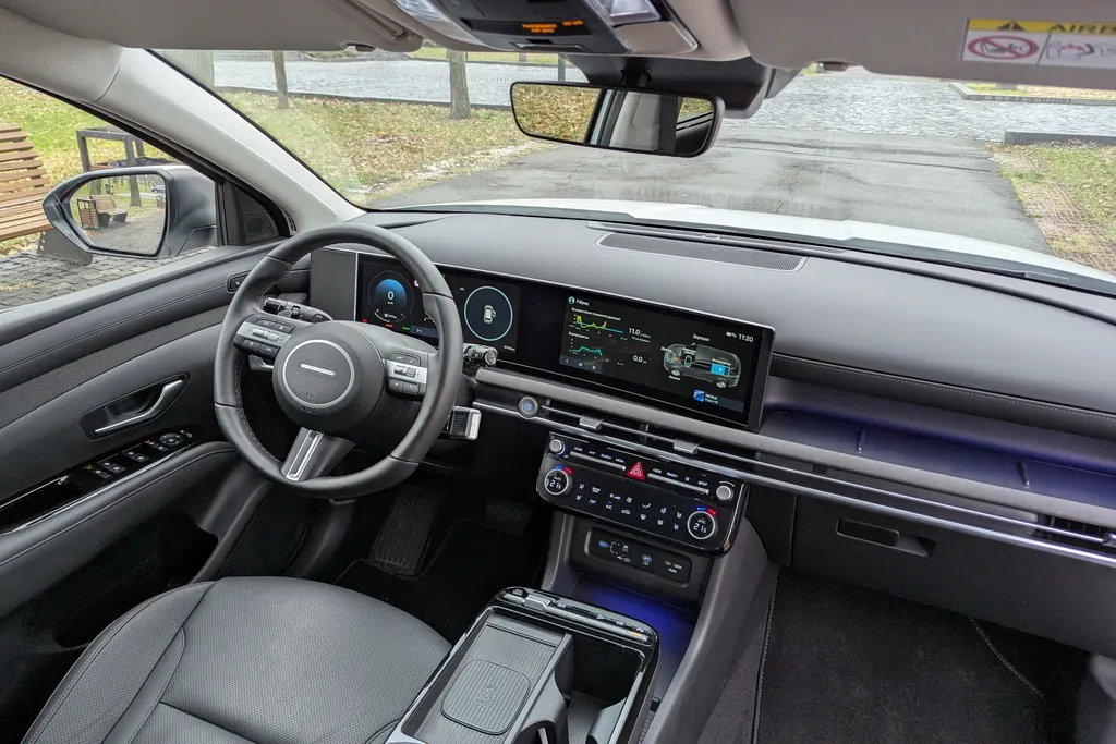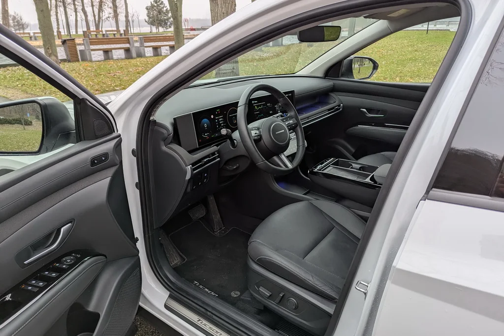Tucson має просторий та комфортний салон. Інтер’єр моделі був повністю змінений, включаючи встановлення нової панелі приладів, центральної консолі, керма та центрального підлокітника. Попри те, що ще цілком доступна модель за помірні гроші, її цифровому кокпіту можуть позаздрити деякі преміальні бренді. Він має широкий вигнутий екран, що об'єднує два 12,3-дюймових дисплея. Лівий є сучасною версією шкали приладів, а на правий, сенсорний, відповідає за інформаційно-розважальні функції.