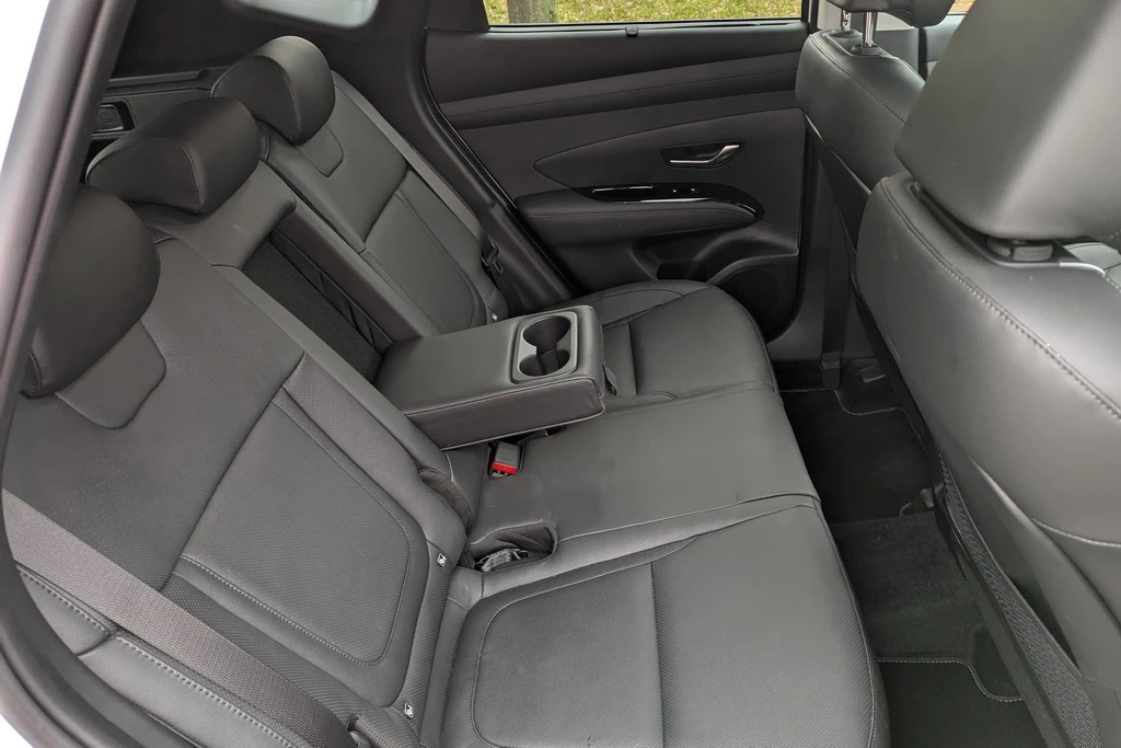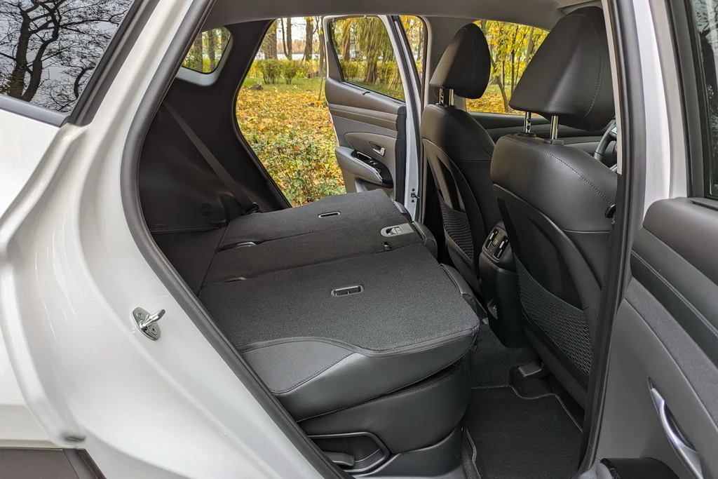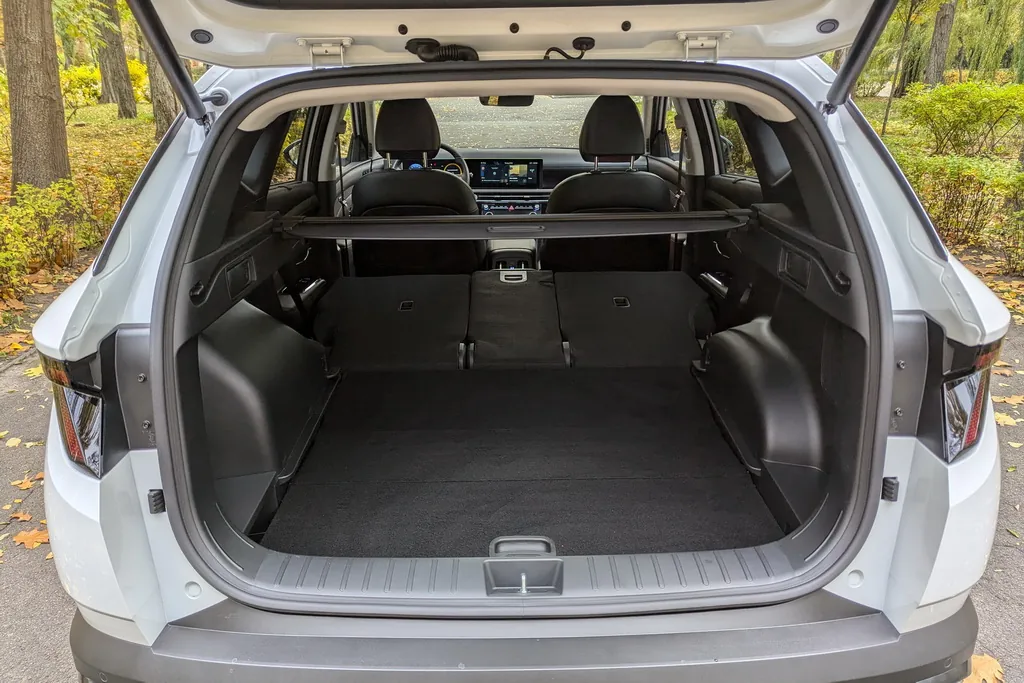 Об’єм багажника Tucson сягає 620 літрів, а якщо скласти спинку другого ряду, то він зросте до 1799 л. У нашого тестового гібрида він трошки менше – 616/1795 л.