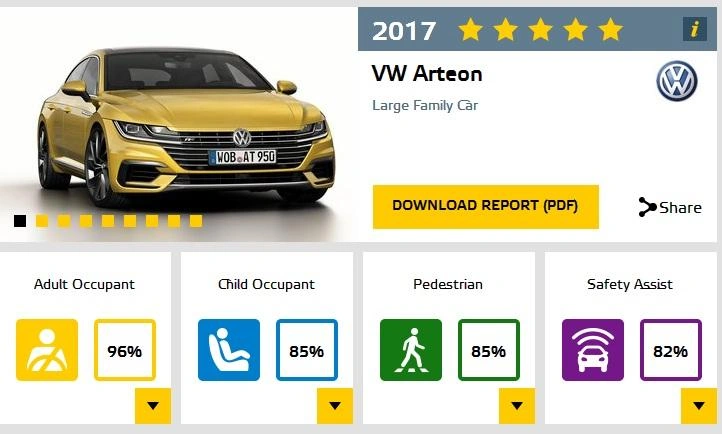 В липні 2017 року новий Volkswagen Arteon, який вже доступний для замовлення в Україні, успішно пройшов випробування Euro NCAP та отримав найвищу загальну 5-зіркову оцінку. Та не просто найвищу!