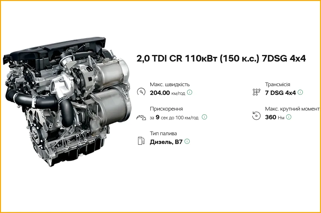 Дизель 2.0 TDI теж добре відомий по моделях концерну Volkswagen. Він поєднує у собі потужність, економність та надійність. Крім того, всупереч загальносвітовим тенденціям, мотор вийшов довговічним, не рідкість екземпляри, які вже перетнули позначку 500 тисяч км.