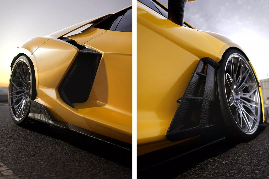 Стандартний аеродинамічний комплект (представлений на жовтому автомобілі) включає спліттер, передній бампер, передні крила, що вентилюються, унікальний капот, активний задній спойлер, повітрозабірник на даху, нове антикрило і дифузор. Всі ці деталі доступні у варіантах кованого карбону, стандартного карбону або полімерного композитного матеріалу з армованим волокном.