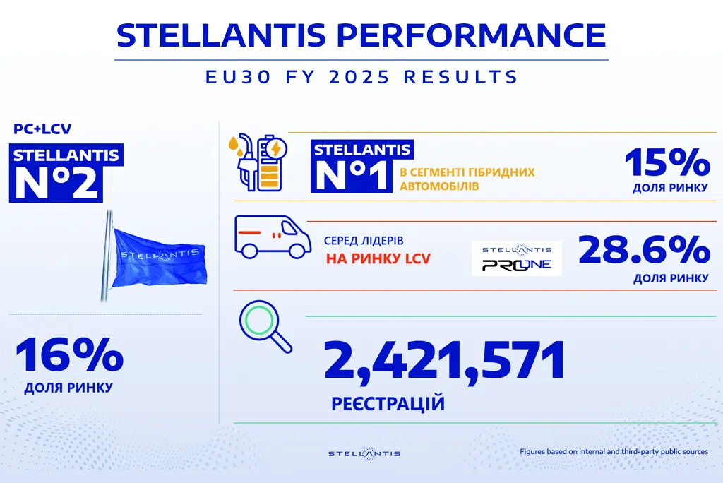 Stellantis повідомляє про реєстрацію 2 421 571 автомобілів власних брендів (легкові автомобілі + легкі комерційні автомобілі) за підсумками 2025 року, підтверджуючи свою міцну позицію одного з лідерів серед автовиробників європейського автомобільного ринку в зоні ЄС-30, займаючи друге місце на ринку.