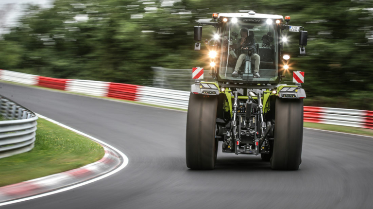 На Нюрбургринг вывели огромный трактор Claas Xerion 5000 VS, который достигает в 7,16 м в длину, 3 м в ширину и 4 м в высоту. Вес трактора составляет 16,5 тонн. Он является самым мощным из тех, что продаются в Германии. Под капотом этого «монстра» разместился 12,8-литровый шестицилиндровый дизельный двигатель мощностью 520 л.с. с крутящим моментом в 2600 Нм, который поступает на все четыре колеса. Агрегат позволяет трактору развивать невероятную скорость в 50 км/ч.