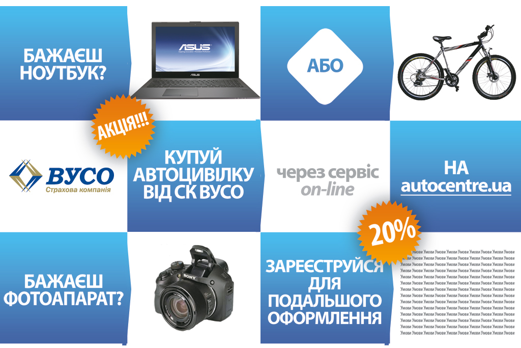 В то же время возможность купить полис ОСАГО на 20% дешевле все еще остался благодаря совместной акции «Автоцентра» и СК ВУСО. Каждый, кто заполнить анкету на специальной странице сайта до 1 сентября 2014 г., сможет до конца 2014 года купить полис «Автогражданки» на 20% дешевле действующего тарифа и получить его в удобное время и место. А если повезет, то еще и выиграть призы. Так, среди тех, кто в эти даты заполнит заявку, будет разыгран фотоаппарат Sony Cyber-Shot DSC-H300. А среди автовладельцев, которые действительно купят «автогражданку» через онлайн-сервис СК «ВУСО», будут разыграны еще два приза – велосипед Ardis Jetix MTB 26 и ноутбук ASUS PU500CA. Все розыгрыши будут производиться методом жеребьевки, а их результаты – сразу же опубликованы на сайте autocentre.ua