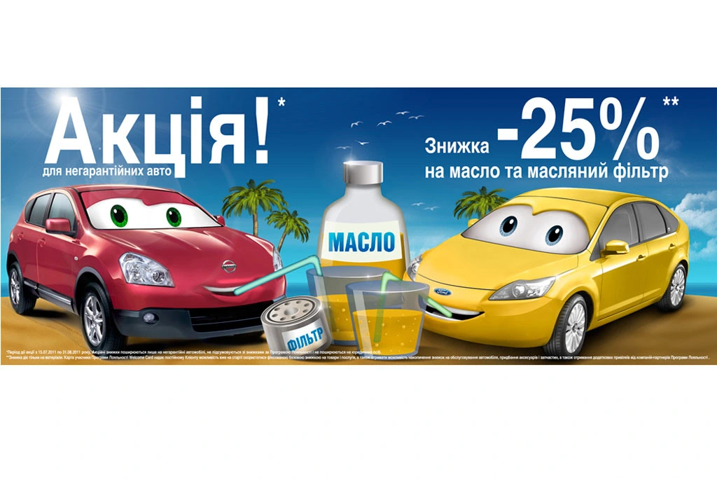 С 15 июля по 31 августа 2011 года в официальных дилерских центрах «ВиДи Санрайз Моторз» и «ВиДи Край Моторз» действует акционное предложение - владельцы негарантийных автомобилей Ниссан и Форд смогут заменить масло и масляный фильтр со скидкой* 25% от стандартной стоимости материалов.