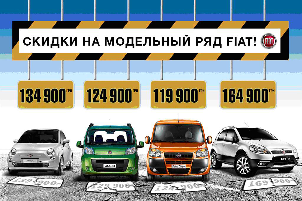На стильный полноприводный кроссовер Fiat Sedici – автомобиль для любителей активного отдыха на природе, скидка составляет 5000 грн. На имиджевый красавчик Fiat Cinquecento скидка в период действия акции составляет 5000 грн, а на Fiat Cinquecento кабриолет, автомобиль, который не даст вам ни единого шанса остаться незамеченным – 10000 грн. На многофункциональный семейный автомобиль Fiat Qubo и надежный и экономичный дизельный грузовик Fiat Doblo скидка составляет 5000 грн.