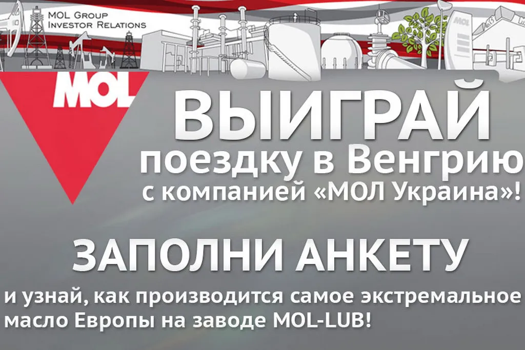 С 2 по 16 сентября каждый желающий может заполнить анкету для участия в розыгрыше поездки в Венгрию с компанией «МОЛ Украина», официальным представителем завода по производству смазочных материалов торговых марок MOL, MOL Dynamic и MOL Essence.