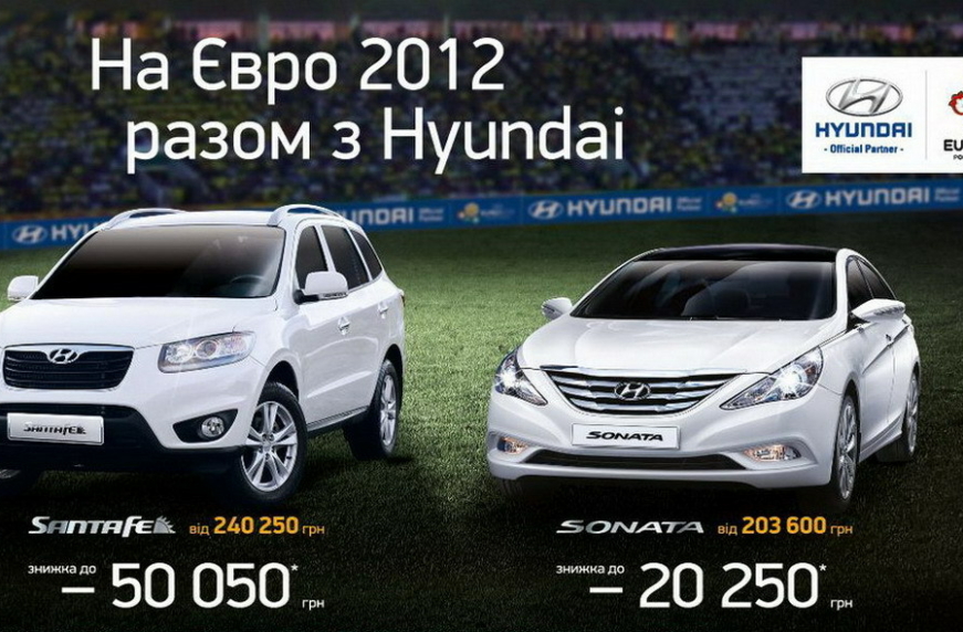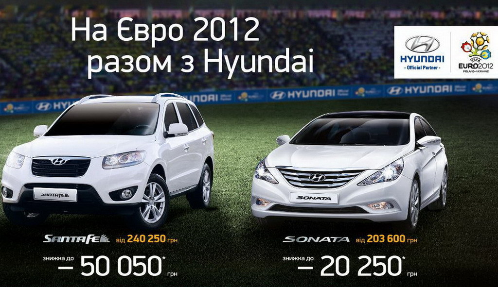 Национальный Автодилер «Богдан-Авто Холдинг» готов порадовать любителей бренда Hyundai запуском новой акции «На Евро-2012 вместе с Hyundai». С 1 июня текущего года во всей сети предприятий Богдан-Авто Холдинг на популярные модели Hyundai Sonata и Hyundai Santa Fe действует специальная скидка до 50050 грн.