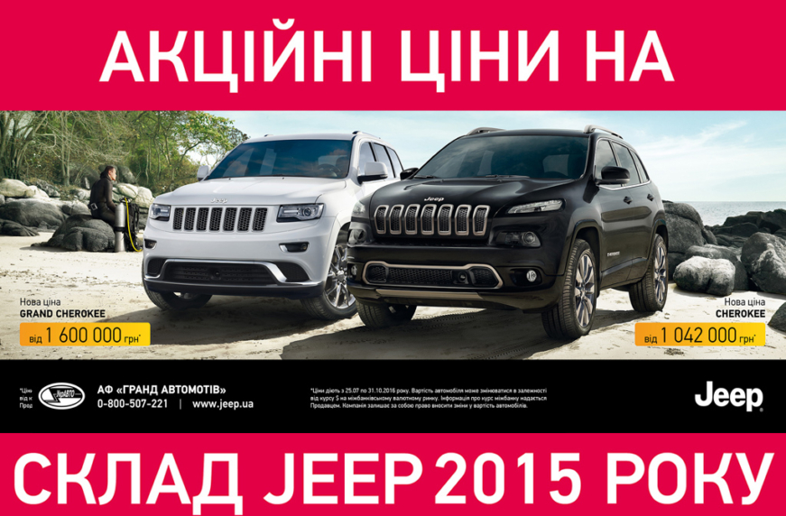 На ряд доступных на складе модификаций акционных автомобилей Jeep Cherokee и Grand Cherokee 2015 года цены снижены, а курс зафиксирован на отметке 24,5 грн. Кроме того, на автомобили Jeep Compass 2014 года и Jeep Wrangler 2015 года курс зафиксирован на отметке 25 грн.