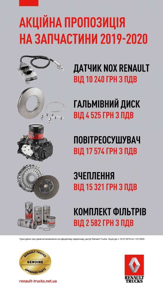 Renault Trucks в Україні анонсує акційні кампанії на придбання запчастин. Перша акція поширюється на запасні частини та комплектуючі для сучасної лінійки вантажівок Renault і буде діяти до липня 2020 року.