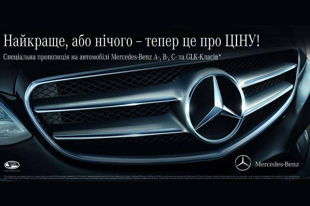 Скидка в размере А – Класс до 61596 грн., В- Класс до 62105 грн., С -класс до 83556 грн., GLK- Класс в 74343 грн., Стоимость указана с учетом НДС по состоянию на 10 апреля 2014 года, и может изменяться пропорционально изменению курса Евро, что устанавливается продавцом на день приобретения .