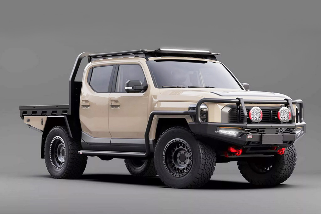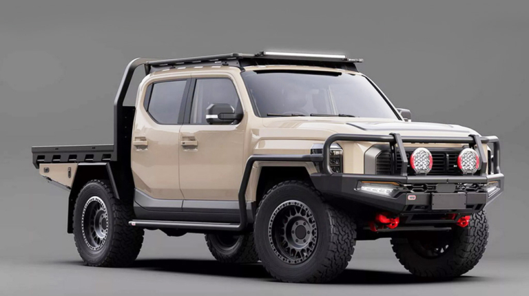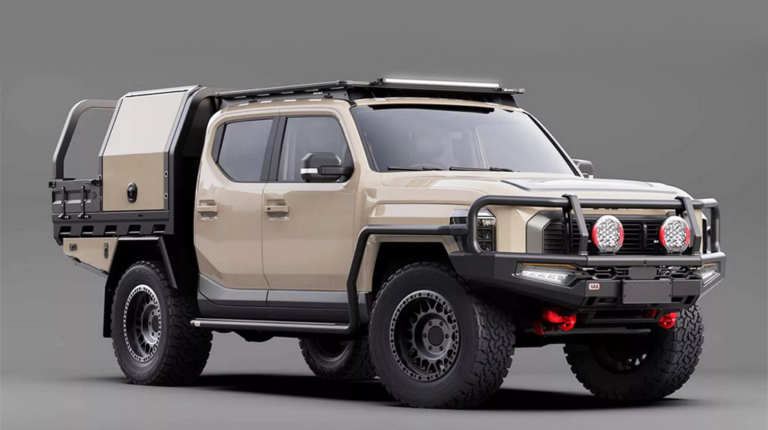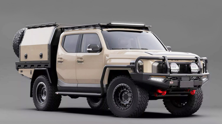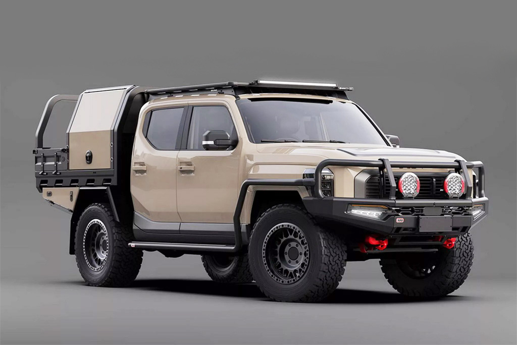 На зображеннях Tasman доповнений комплектом оригінальних легкосплавних дисків із “зубастою” позашляховою гумою. А комплект для модернізації підвіски дозволить суттєво збільшити кліренс порівняно із серійною версією пікапа.