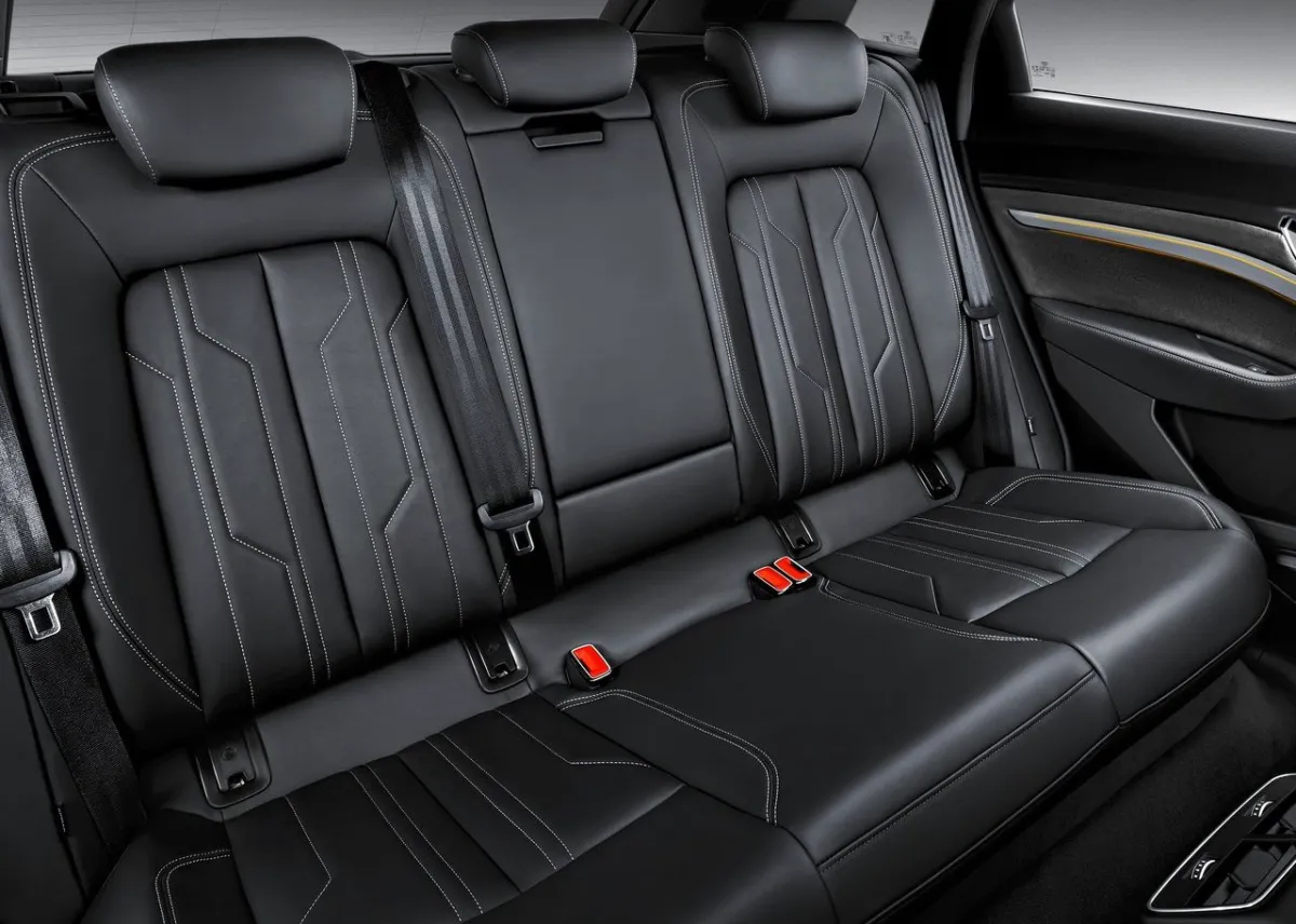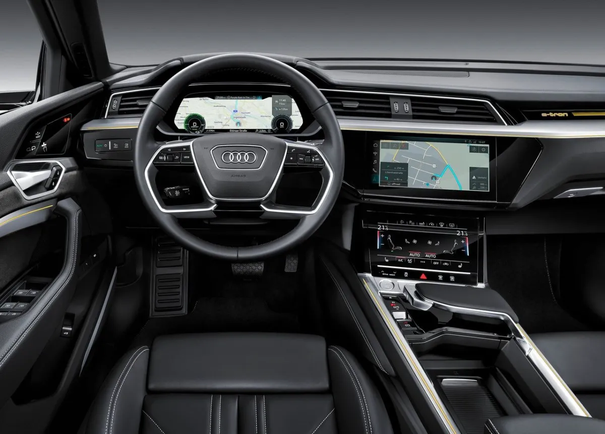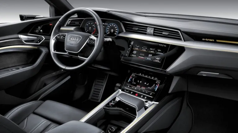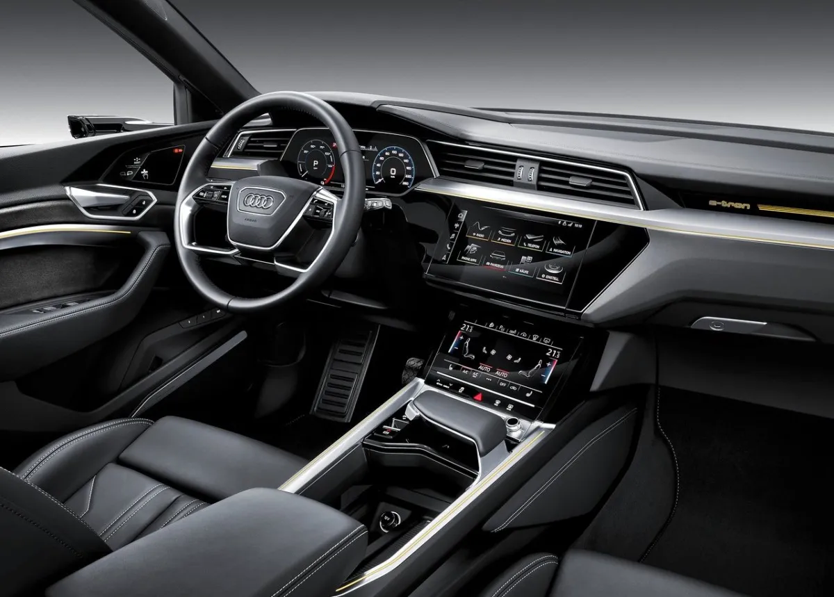 Всего на приборной панели можно насчитать три дисплея (+2 в случае установки камер вместо наружных зеркал), из-за чего в салоне практически отсутствуют аналоговые переключатели. В целом же внутри электрический кроссовер не пытается выглядеть футуристично, благодаря этому в интерьере безошибочно идентифицируется дизайн Audi.
