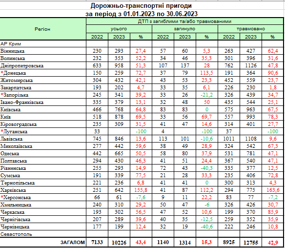 Так, за шість місяців 2023 року на дорогах країни сталося 10 226 ДТП (в середньому 57 інцидентів щодня), що на 43,4% більше, ніж за аналогічний період минулого року. Загинуло в аваріях 1314 людини та ще 12 755 отримали травми. Порівняно з 2022 роком, смертність зросла на 15,3%. Щодо травматизму в аваріях, то він збільшився на 42,9%.