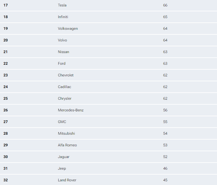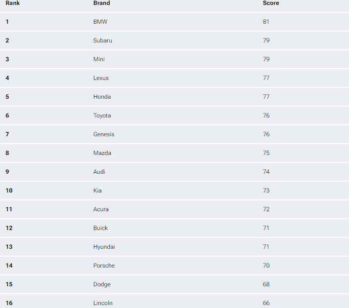Третє місце у рейтингу посів дочірній бренд BMW Mini, який також показав чудові результати у дослідженнях. Четверту та п’яту позиції розділили між собою Lexus та Honda, а ось японська Toyota опустилася на шосте місце у рейтингу.
