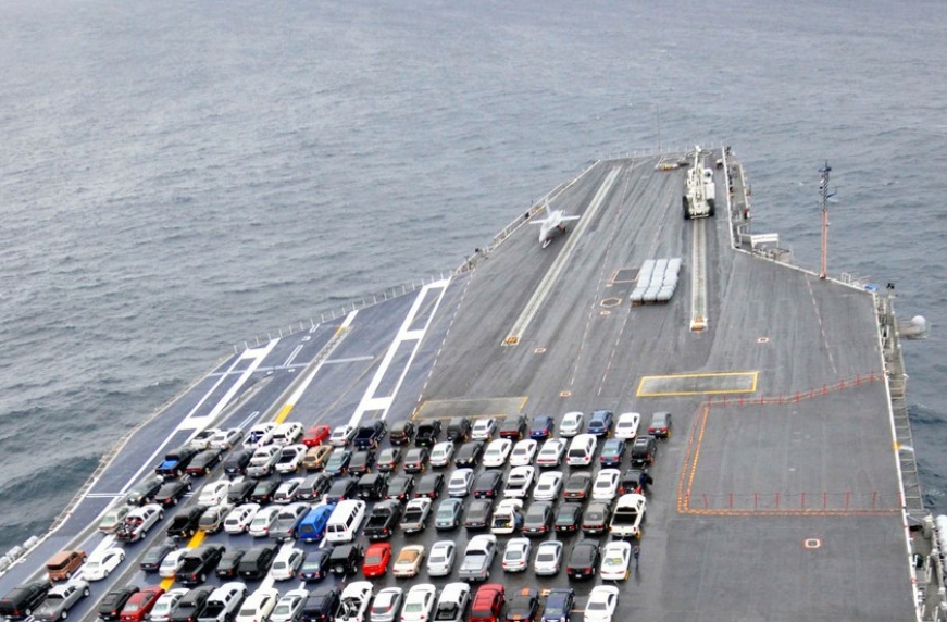 Американский боевой корабль, направляясь на ремонт, используется своей командой вместо парома. Дело в том, что авианосец армии США «Рональд Рейган» класса «Нимиц» направляется на длительный плановый ремонт в док. Зная любовь американских граждан к собственному транспорту, командование разрешило экипажу взять на борт личные автомобили для передвижения с их помощью в городе ремонта.