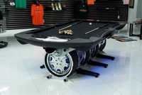 Этот автомобильный бильярдный стол поистине завораживает. Основой стола является массивный стальной каркас с хромированными элементами, похожий на выхлопную систему. Роль ножек выполняют четыре огромных колесных диска с низкопрофильной резиной.