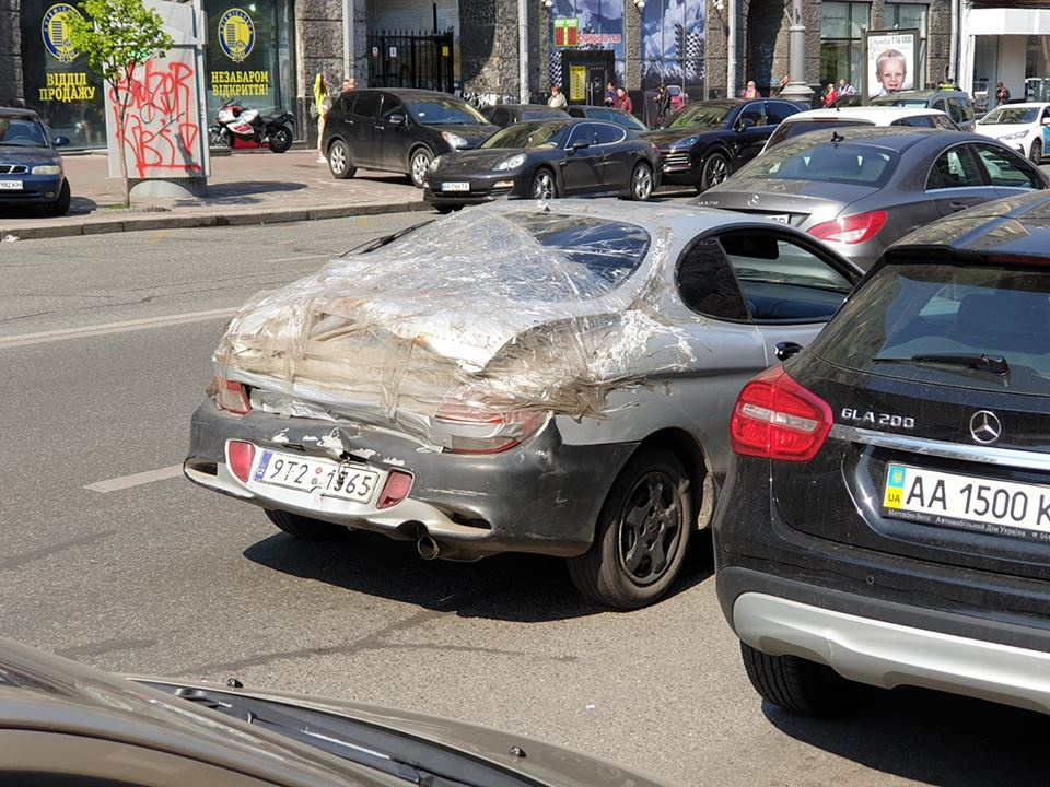 Данный автомобиль, который засняли в Киеве, получил при ДТП довольно существенные повреждения задней части, и ладно бы владелец был оставил всё как есть, раз уж не имел возможности отремонтировать машину, но он решил “восстановить” авто своими силами. При помощи полиэтилена и скотча. Что из этого вышло, смотрите сами: