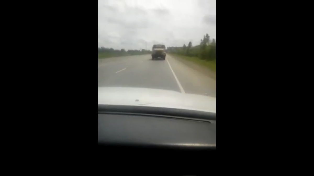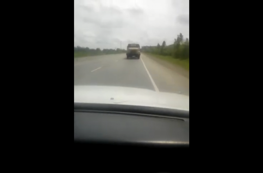 Один з автомобілістів зняв на шосе вельми цікаву картину. На швидкості близько 80 км/год якісь сміливці буксирували…. КрАЗ! Причому везли його задом.