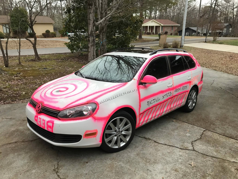 Американка Елліс вирішила розмалювати свій універсал Volkswagen Jetta перед тим, як повернути його виробнику. На білому кузові з’явилися яскраві рожеві візерунки і веселі написи.