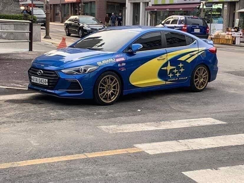 В легендарном прошлом в WRC гоночные Субару носили фирменную ливрею, которая узнавалась издалека даже сквозь густые клубья пыли. Жёлтое созвездие на синем кузове запомнилось всем. Теперь этот костюм на себя зачем-то примерила Элантра… Мы не знаем (вы тоже), чем руководствовался владелец авто. Парень, похоже, ты все перепутал!