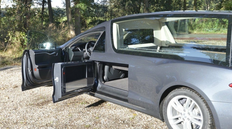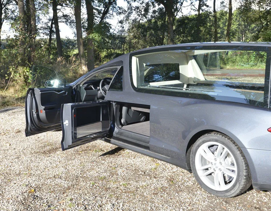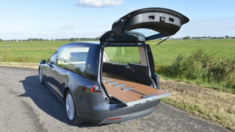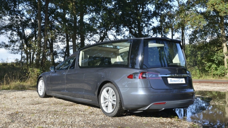 На створення катафалка з серійної Tesla Model S голландським компаніям Vander der Lans&Busscher BV і RemetzCar знадобилося 8 місяців. Перший і поки що єдиний у світі катафалк Тесла представлять на виставці похоронного бізнесу Funeral Exhibition 2016.