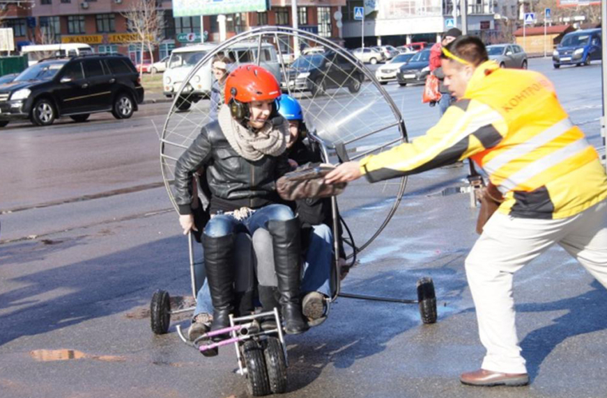 На одной из остановок общественного транспорта в районе ВДНХ специалист по новым впечатлениям объявил о том, что в связи с автомобильными пробками троллейбусы в этот день ездить не будут. И как альтернативу Виталий Зорин предложил пассажирам воспользоваться передвижением на маршрутном паратрайке. Когда же телега с крылом на самом деле подъехала на остановку, реакция у людей была самая разная – от восторга до испуга.