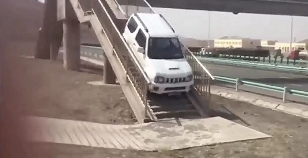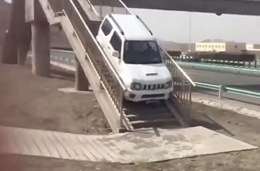 Так, в місті Сіньян, який розташовується на півдні Китаю, водій білого Suzuki Jimny пропустив потрібний розворот на автомагістралі і не знайшов кращого виходу, як перетнути дорогу через надземний пішохідний перехід. Горе-водій зумів подолати на своєму “Джимні” сходові прольоти, важкопрохідні естакади і доволі вузькі повороти. Йому навіть пощастило з тим, що на переході в цей момент не було пішоходів.