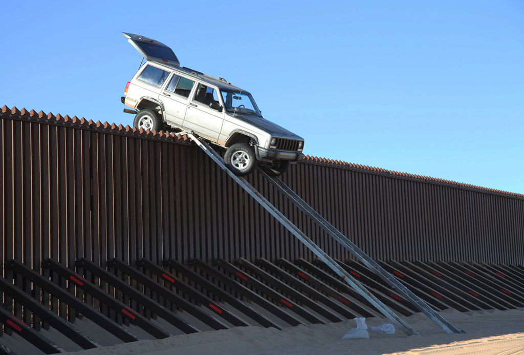 Оригинальную находку обнаружил пограничный американский патруль на одном из безлюдных участков государственной границы США и Мексики. На более, чем 4-метровой высоте на специальном заборе между двумя странами завис вполне исправный Jeep Cherokee. Как он туда попал, стало очевидно сразу: оказавшиеся в необычной ситуации контрабандисты не смогли даже разобрать рампу, по которой планировалось наладить новый «погранпереход».