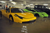 Среди жертв наводнения можно заметить такие эксклюзивные и дорогие сердцу ценителя автомобили, как Lamborghini Gallardo, Ferrari 458 Italia, Rolls-Royce Phantom, Aston Martin, Maserati GranTurismo, несколько роскошных Audi и BMW, и очень одинокий Porsche.