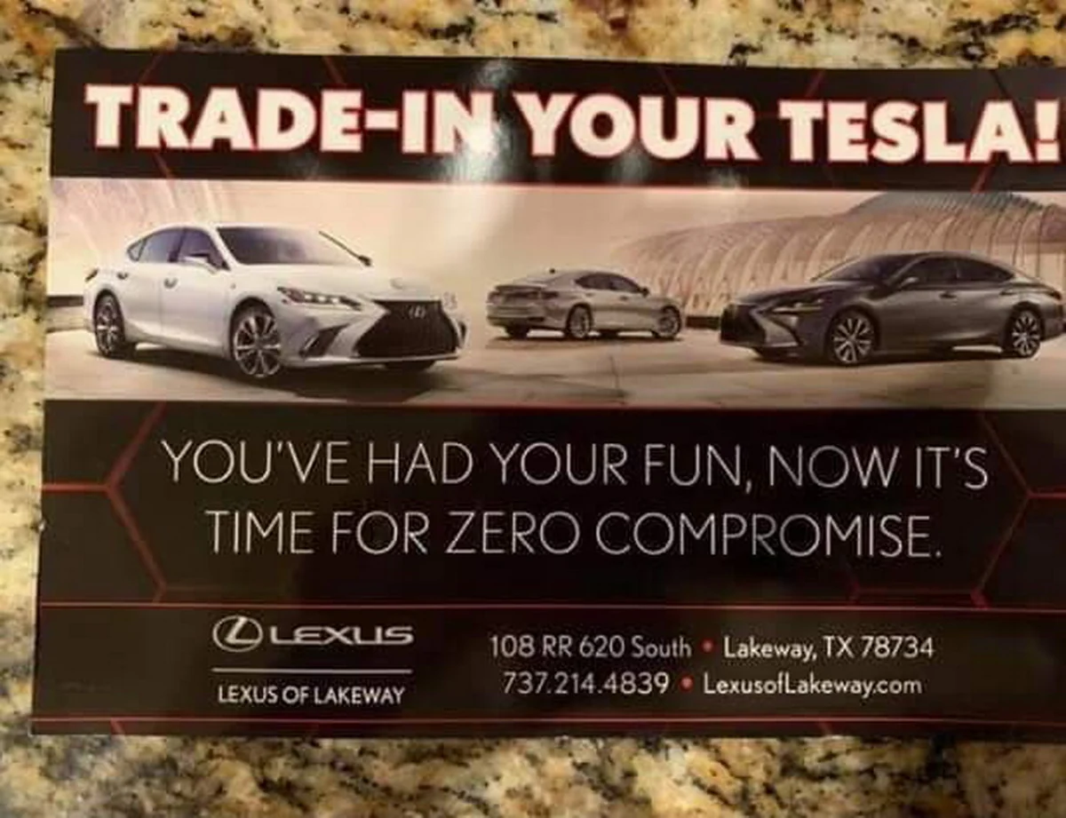 Автором рекламной кампании оказался автосалон Lexus of Lakeway, расположенный недалеко от Остина. Как сообщает Electrek, дилер каким-то образом раздобыл личную информацию владельцев электрокаров Tesla и разослал рекламные буклеты с провокационным предложением. Помимо скидки всем, кто воспользуется программой трейд-ин, обещано отсутствие задержек с запчастями. Надпись на обратной стороне флайера гласит, что по оценкам американской компании JD Power, Lexus - бренд No1 среди автомобилей люкс класса с точки зрения качества и надежности, и No2 по уровню удовлетворенности клиентов, что немаловажно.